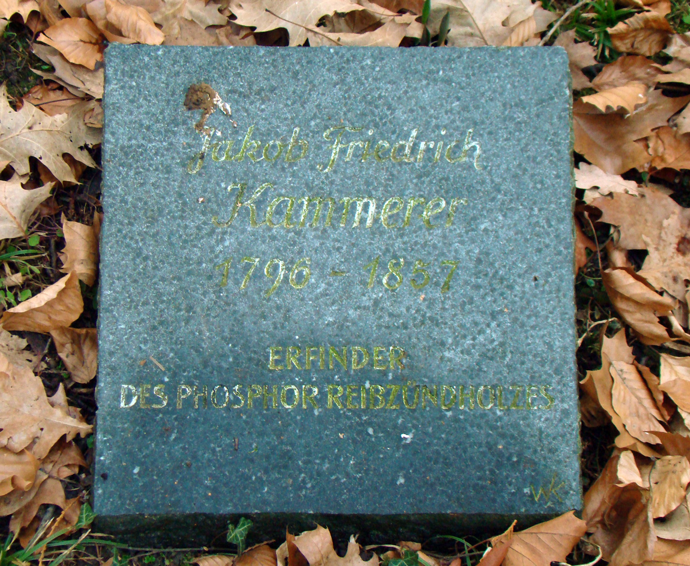 Deutsch: Alter Friedhof in Ludwigsburg, Gedenkstein Kammerer (Erfinder des Phosphorreibzündholzes) |