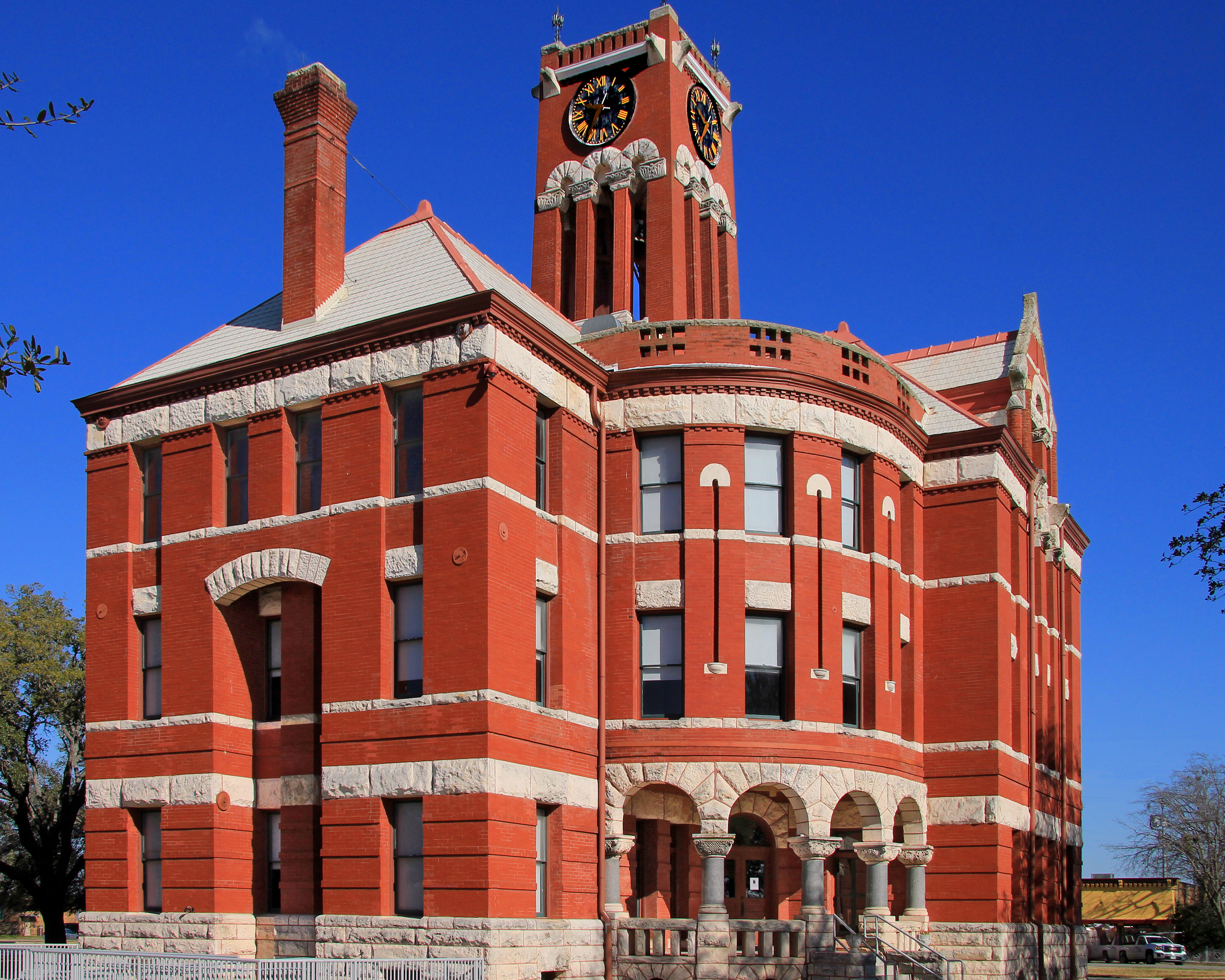 English: The Lee County, Texas courthouse in, Giddings, Texas, United States. The courthouse was built in 1899 and is designed in the Richardsonian Romanesque style of architecture. The building was designated a Recorded Texas Historic Landmark in 1968 and was listed on the National Register of Historic Places on May 30, 1975. |