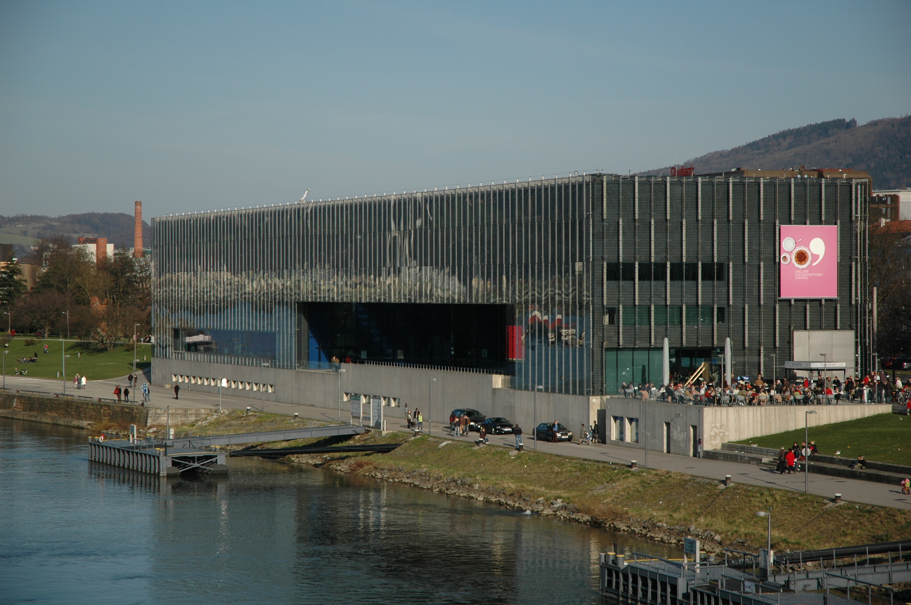 Description Linzer Museum "Lentos" von der Donau gesehen.