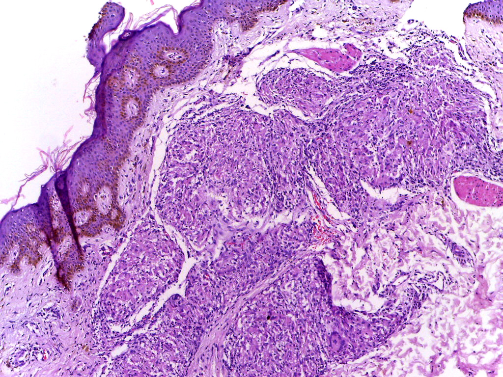 English: Section of skin showing epithelioid granulomas in the dermis and reduction in the number of appendages. H&E stain. |