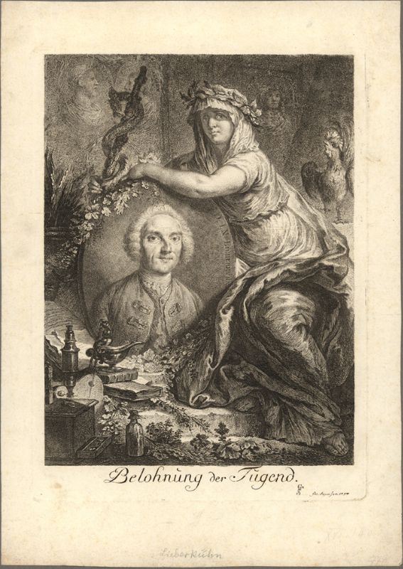 Deutsch: Personifikation der Tugend, hier mit Äskulapstab, die sitzend mit beiden Armen das Medaillon mit dem Bildnis Lieberkühns umgreift. |
