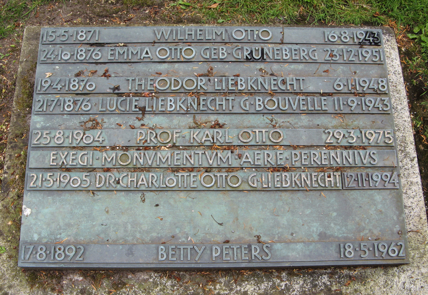 English: Detailed image of grave of Wilhelm and Emma Otto, Theodor and Lucie Liebknecht, Karl and Charlotte Otto, and Betty Peters at Section 17M, plot 3-4, Stadtfriedhof Engesohde, Hannover, Germany. Deutsch: Grabplatte von Wilhelm und Emma Otto, Theodor und Lucie Liebknecht, Karl und Charlotte Otto, und Betty Peters in Abteilung 17M, Grabstelle 3-4, Stadtfriedhof Engesohde, Hannover |