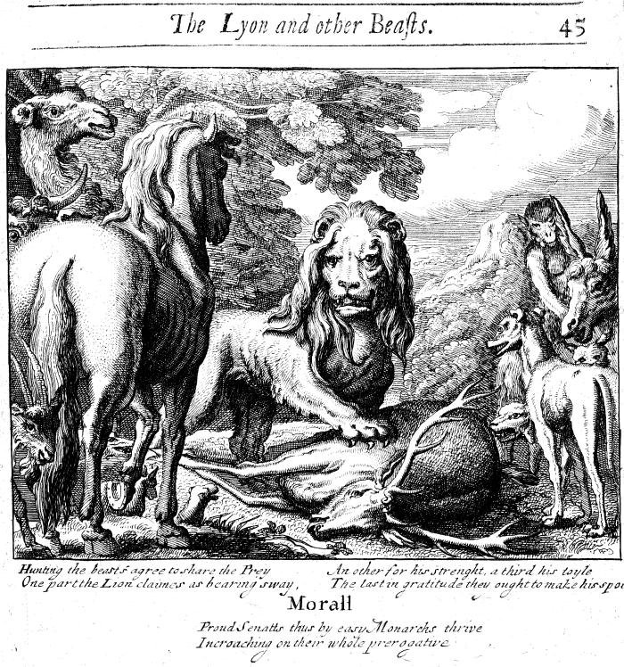 English: The illustration to "The lion and other beasts" from Francis Barlow's edition of Aesop's Fables (London, 1687) |
