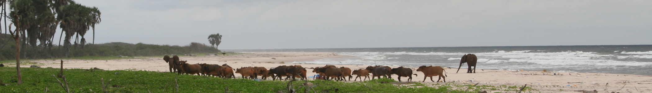 English: Banner. Buffalos and forest elephants roam the beach in Loango National Park |
