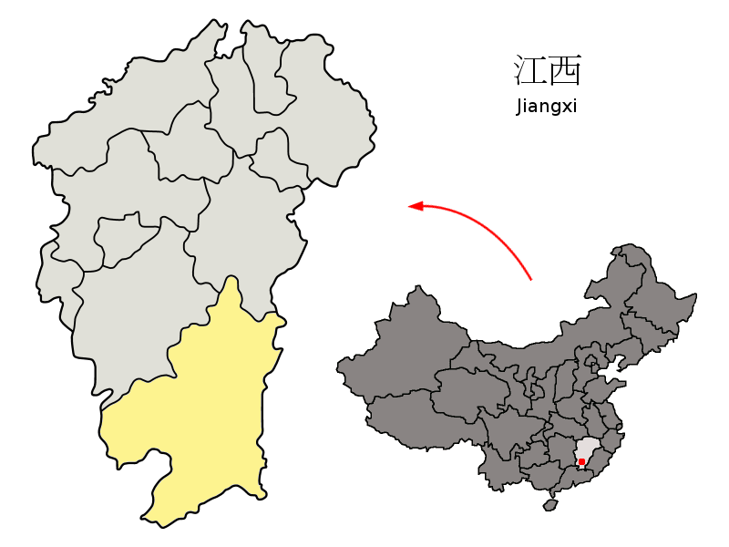 Location of Ganzhou Prefecture (yellow) within Jiangxi Province of China Map drawn in december 2007 using various sources, mainly : |