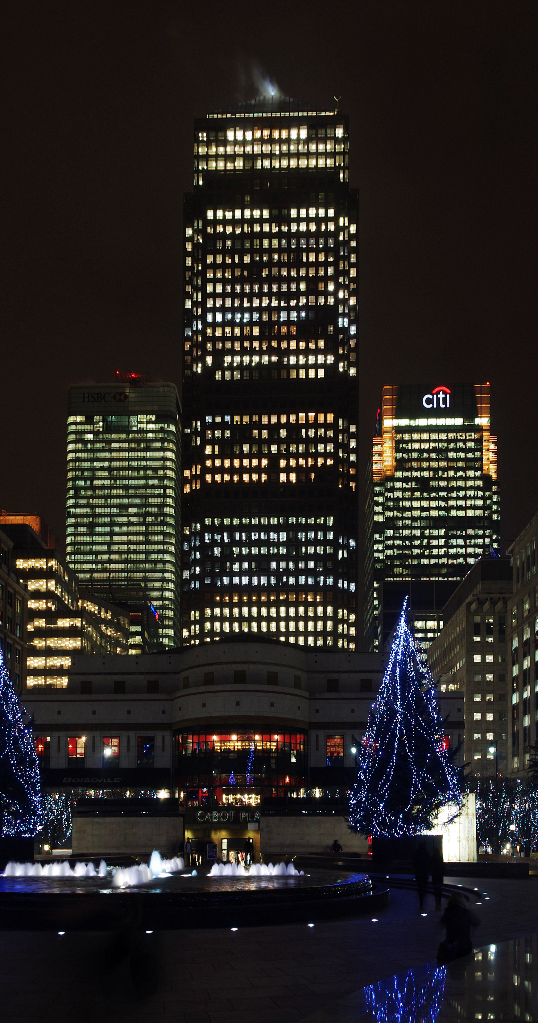 English: Christmas trees and fountains in Cabot Square, London. |