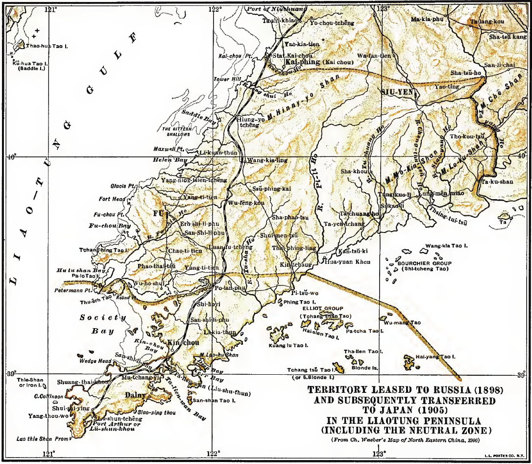 Deutsch: Karte des von Russland 1898 "gepachteten" und 1905 an Japan transferierten Gebietes der Liaodong Halbinsel sowie der neutralen Zone English: Territory Leased to Russia (1898) and subsequently transferred to Japan (1905) in the Liaotung Peninsula (including the neutral zone) |