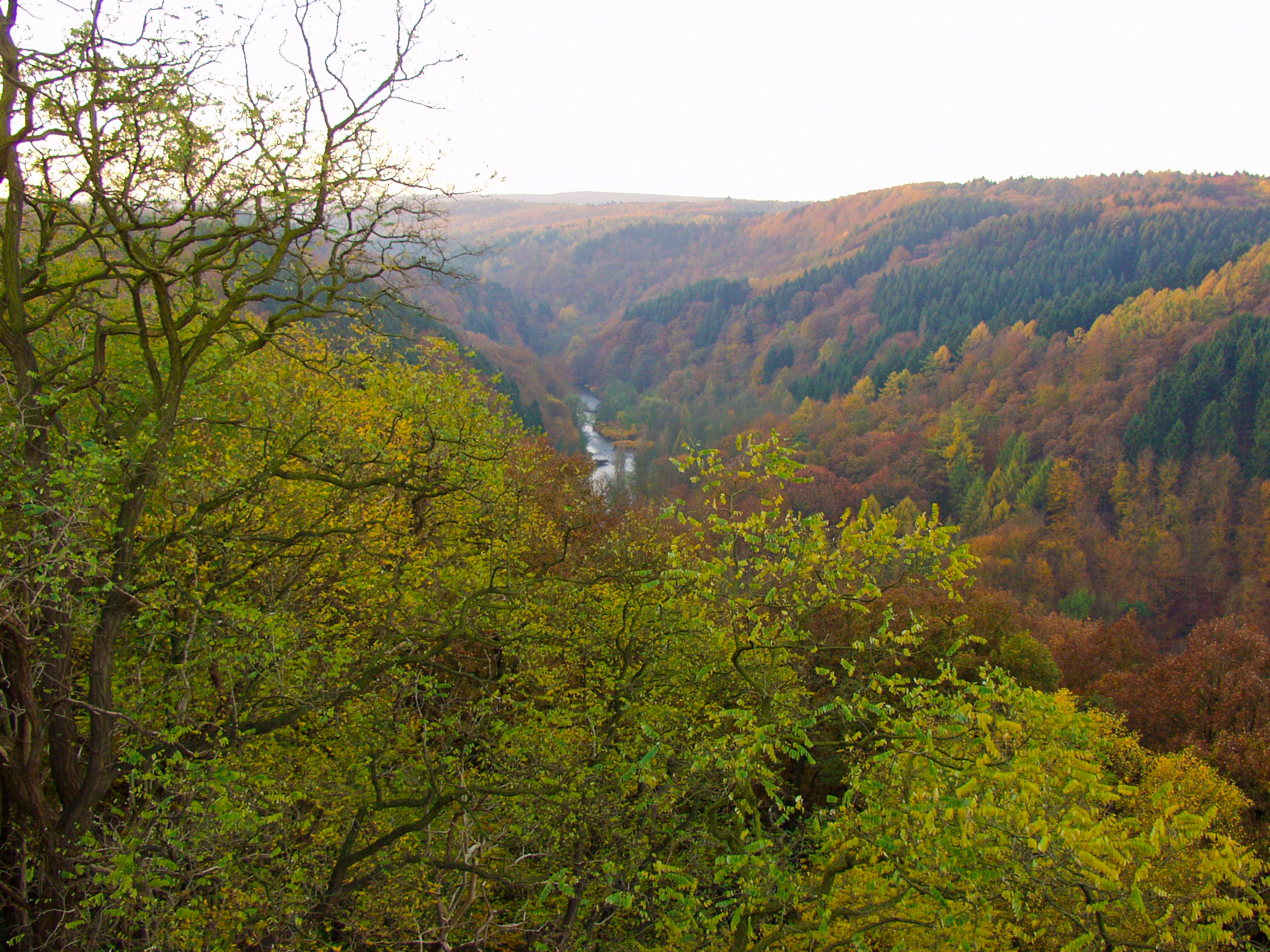 Deutsch: Blick von der Müngstener Brücke auf die Naturschutzgebiete RS-019 (Wupper und Wupperhänge südlich Müngsten) auf der linken Seite und SG-002 (Tal- und Hangbereiche der Wupper mit Seitenbächen) auf der rechten Seite |