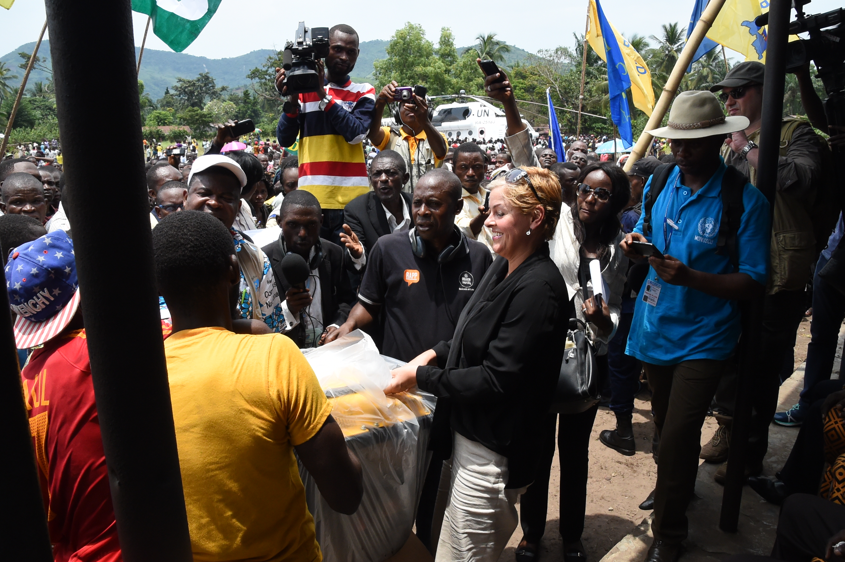 English: A huge crowd witnessed the delivery by MONUSCO of 29 generators to the CENI antenna of Popokabaka, Kwango Province. The ceremony took place in the presence of the Vice-Governor of the Kwango Province, CENI Rapporteur, MONUSCO Chief of Staff and representatives of the international community and media. |