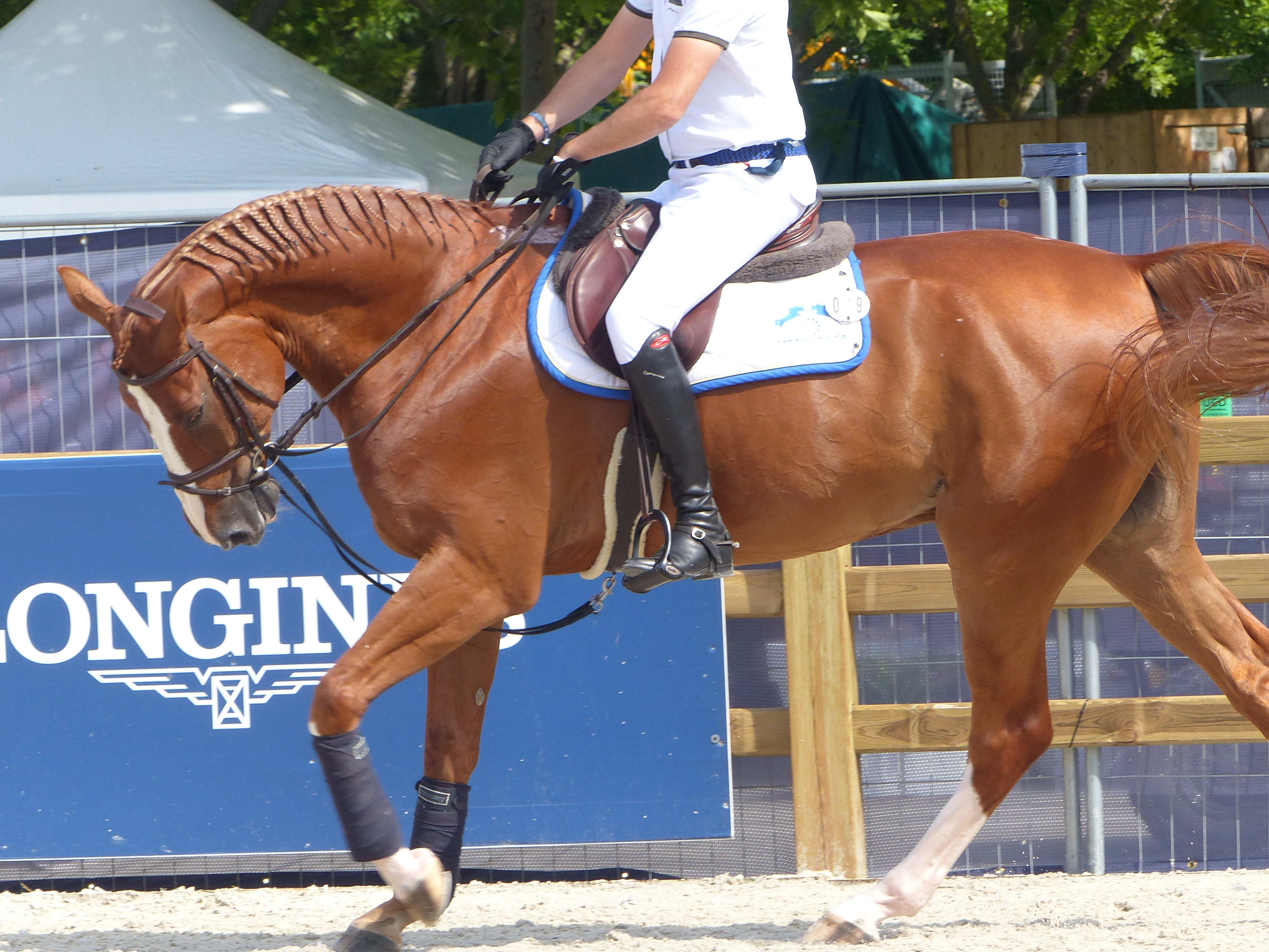 Français : Le cheval Mandato van de Neerheide (en rênes allemandes et positionné sous la verticale) au Paris Eiffel Jumping |