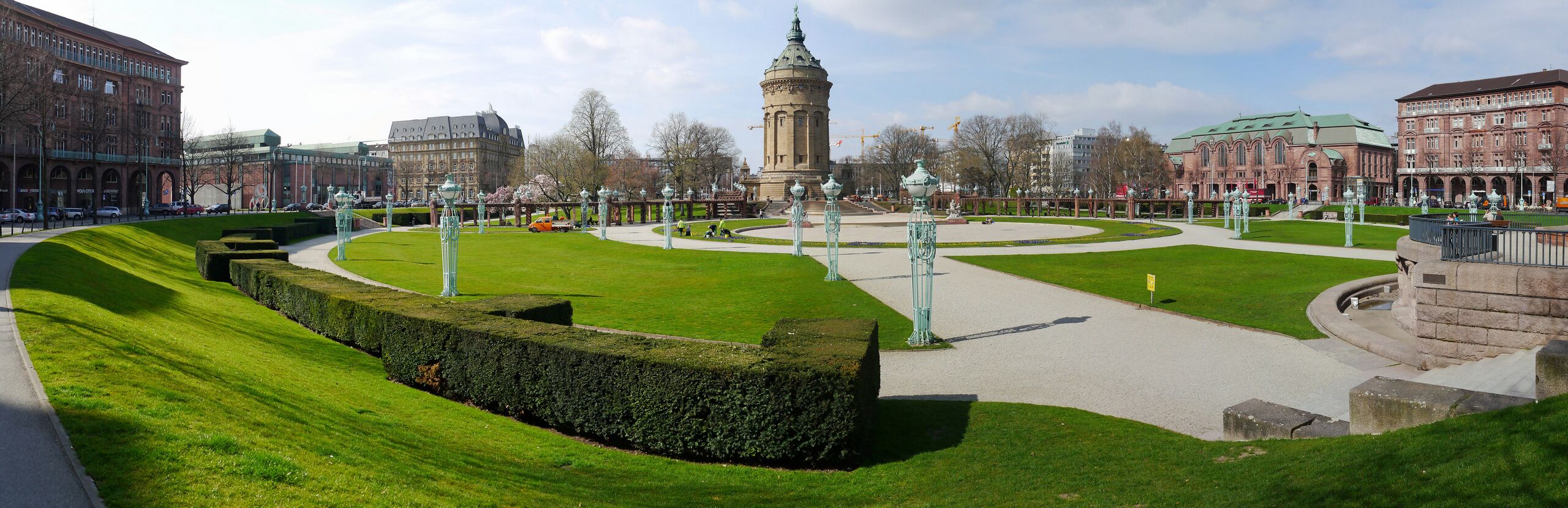 Deutsch: Der Friedrichsplatz in Mannheim. V.l.n.r.: Kunsthalle (Rückseite), Maritim Hotel, Wasserturm und Rosengarten. |