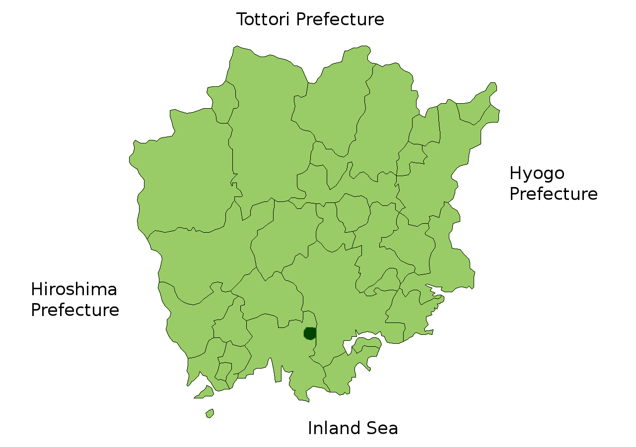 Map of Okayama Prefecture highlighting Hayashima town. Borders of map as of October, 2006. (blank map used from [1]) See also Image:OkayamaMapCurrent.png. |