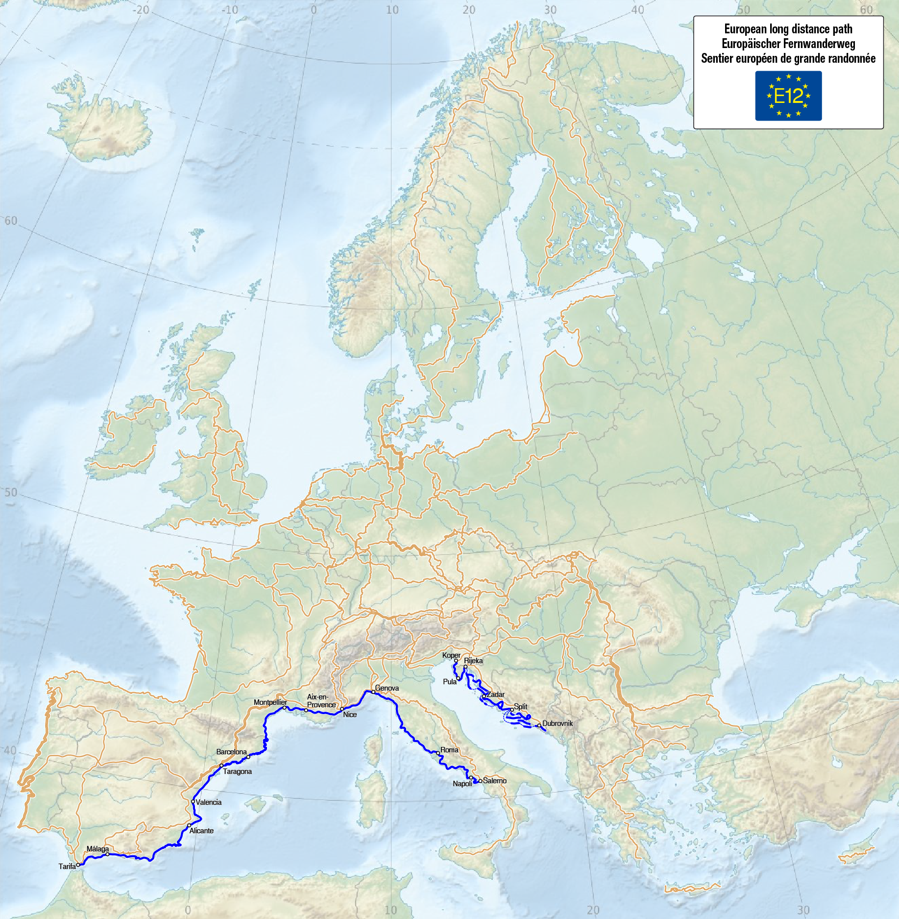 Deutsch: Karte des Europäischen Fernwanderwegs E12