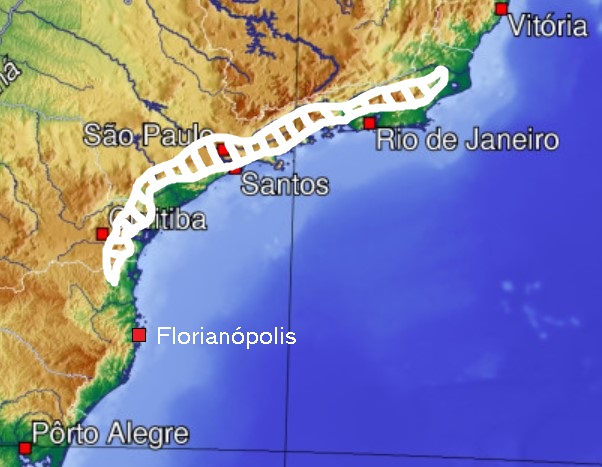 Català: Superfície aproximada de la Serralada del Mar, entre els estats de Rio de Janeiro i Santa Catarina. |