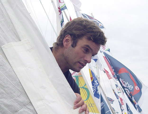 English: Marc Thiercelin prepares to take part in the 2004 edition of the Vendée Globe. Les Sables d'Olonne, France.