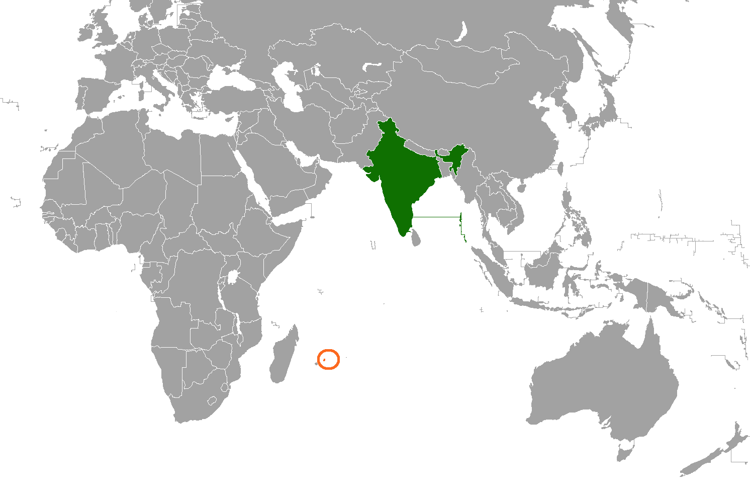 English: Map showing the locations of both India and Mauritius |