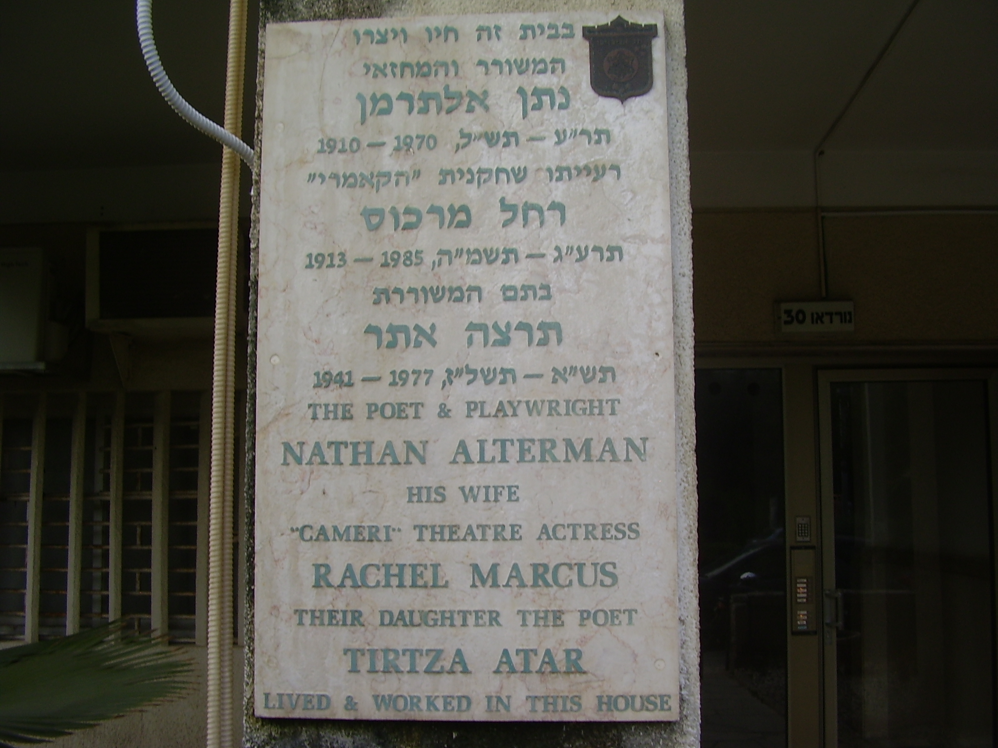 שלט זיכרון במקום מגוריו של נתן אלתרמן ,רחל מרכוס ותרצה אתר בשדרות נורדאו 30 בתל אביב