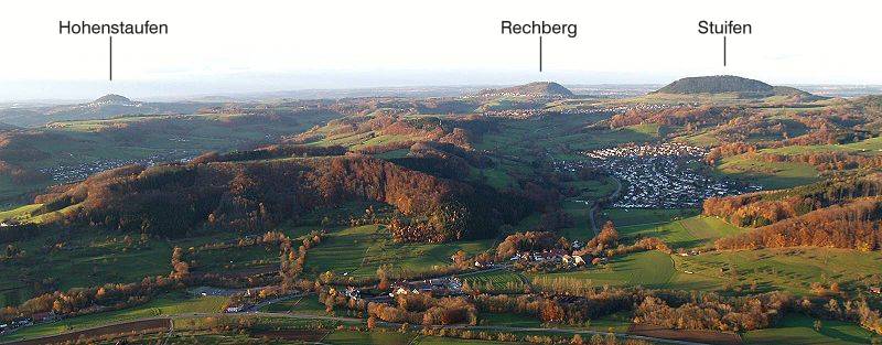 Deutsch: Blick vom Messelstein nach Norden auf die Drei Kaiserberge |