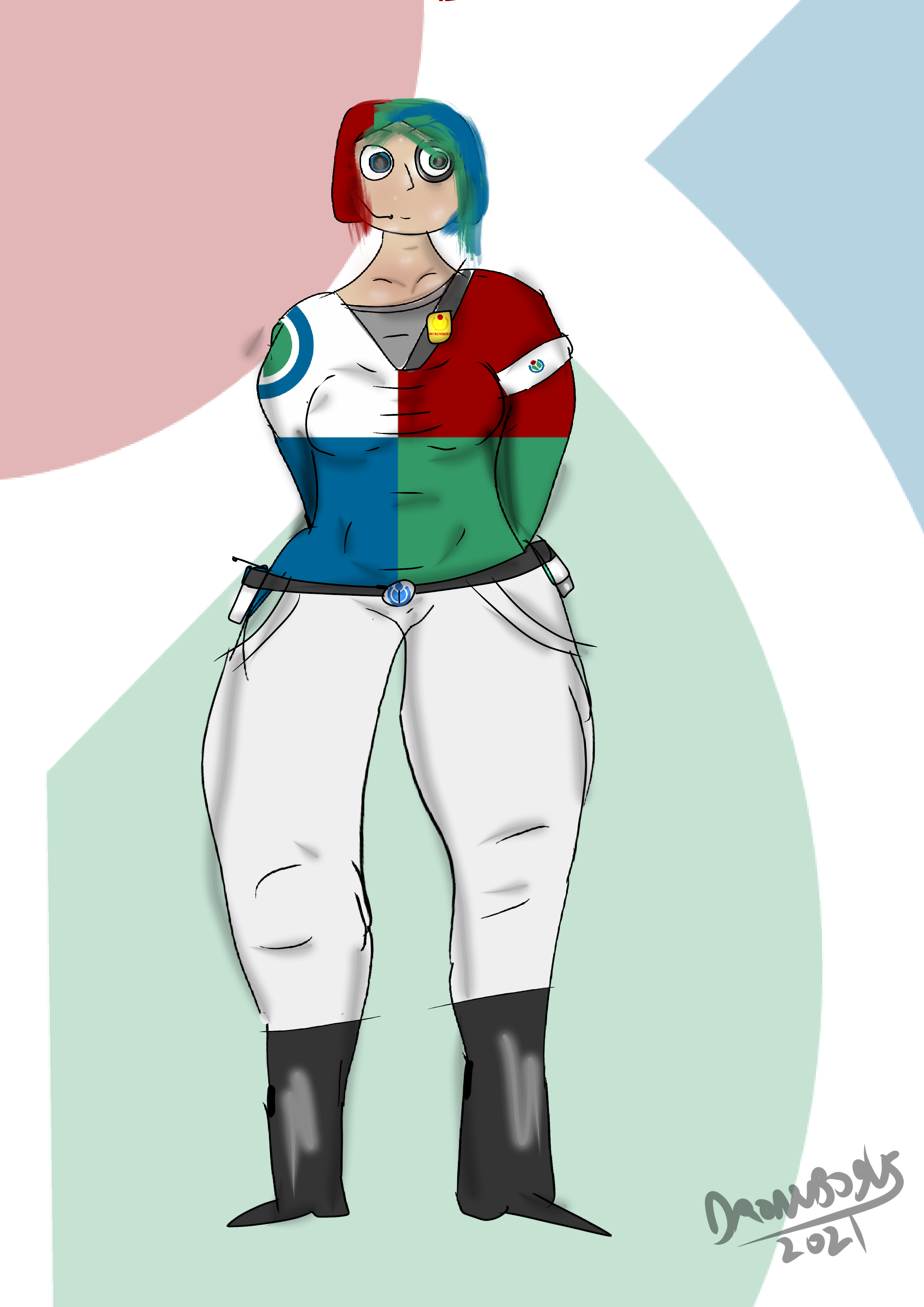 English: A long overdue moe anthropomorphic mascot for metawiki, first in a planned series for all the WM projects. I always thought MetaWiki was sort of futuristic-seeming somehow so I went with a Star-Trek inspired design that incorporated several Wikimedia flag designs |