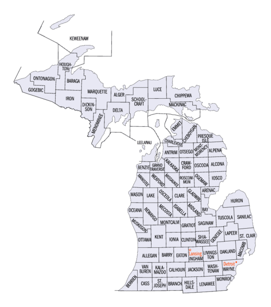Michigan-counties-map.gif (531 × 600 بكسل حجم الملف: 52 كيلوبايت، نوع MIME: image/gif)