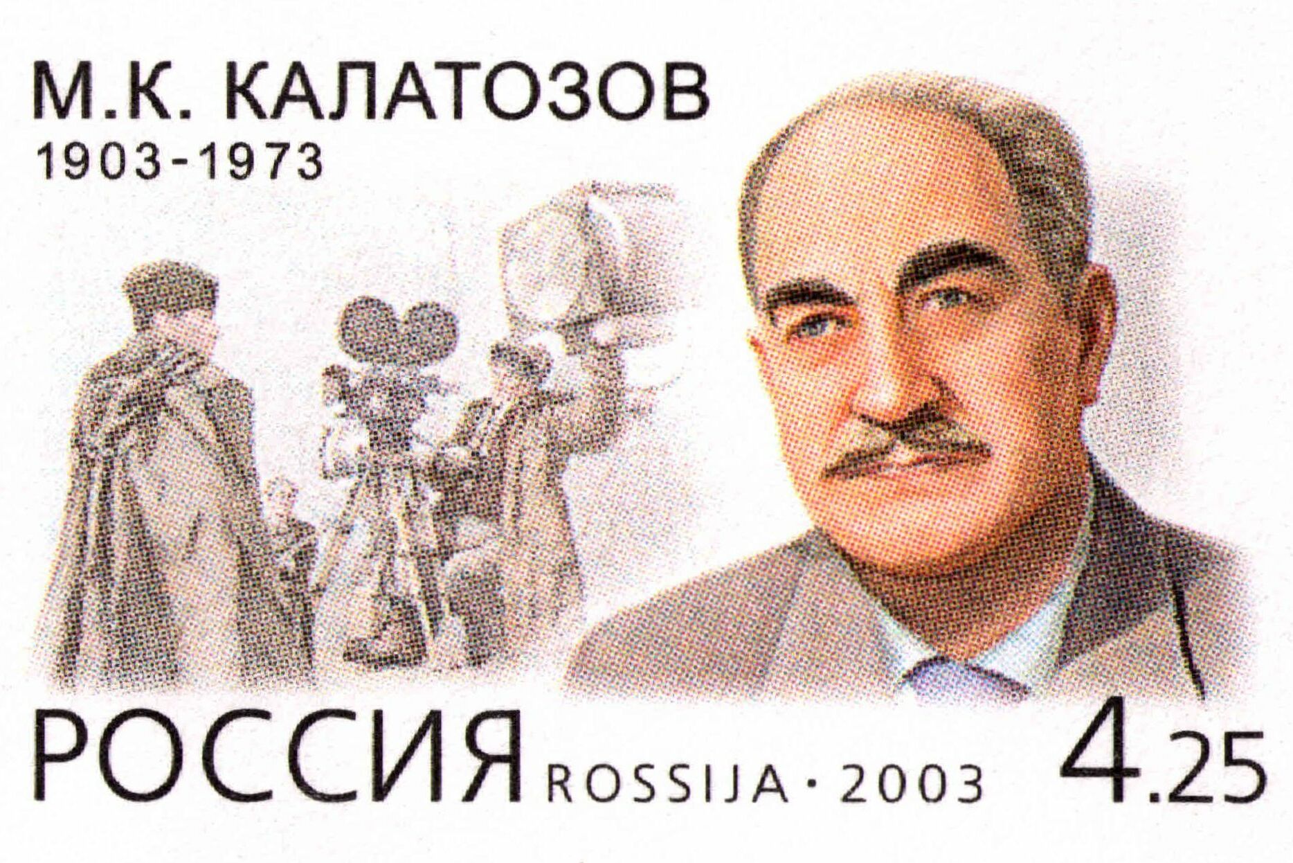 English: 100th anniversary of the Soviet film director Mikhail Kalatozov (1903—1973). The ilustrated postal stationery envelope with the commemorative stamp, Russia, 2003. Catalogue of PTC Marka # 130-кор03. The commemorative stamp (4.25 rubles): the portrait of M. Kalatozov. The illustration: the scenes from the Soviet film The Cranes Are Flying (1957), Aleksey Batalov in the role of Boris, Tatiana Samoilova as Veronika {{country data 100 лет со дня рождения кинорежиссёра Михаила Калатозова (1903—1973). Художественный конверт с оригинальной маркой, Россия, 2003 г., Каталог ИТЦ «Марка» № 130-кор03. Художник конверта О. Юдин. Марка (4,25 руб.): портрет М.К. Калатозова. Иллюстрация: кадры из кинофильма «Летят журавли» (1957 г.), Алексей Баталов в роли Бориса, Татьяна Самойлова в роли Вероники.