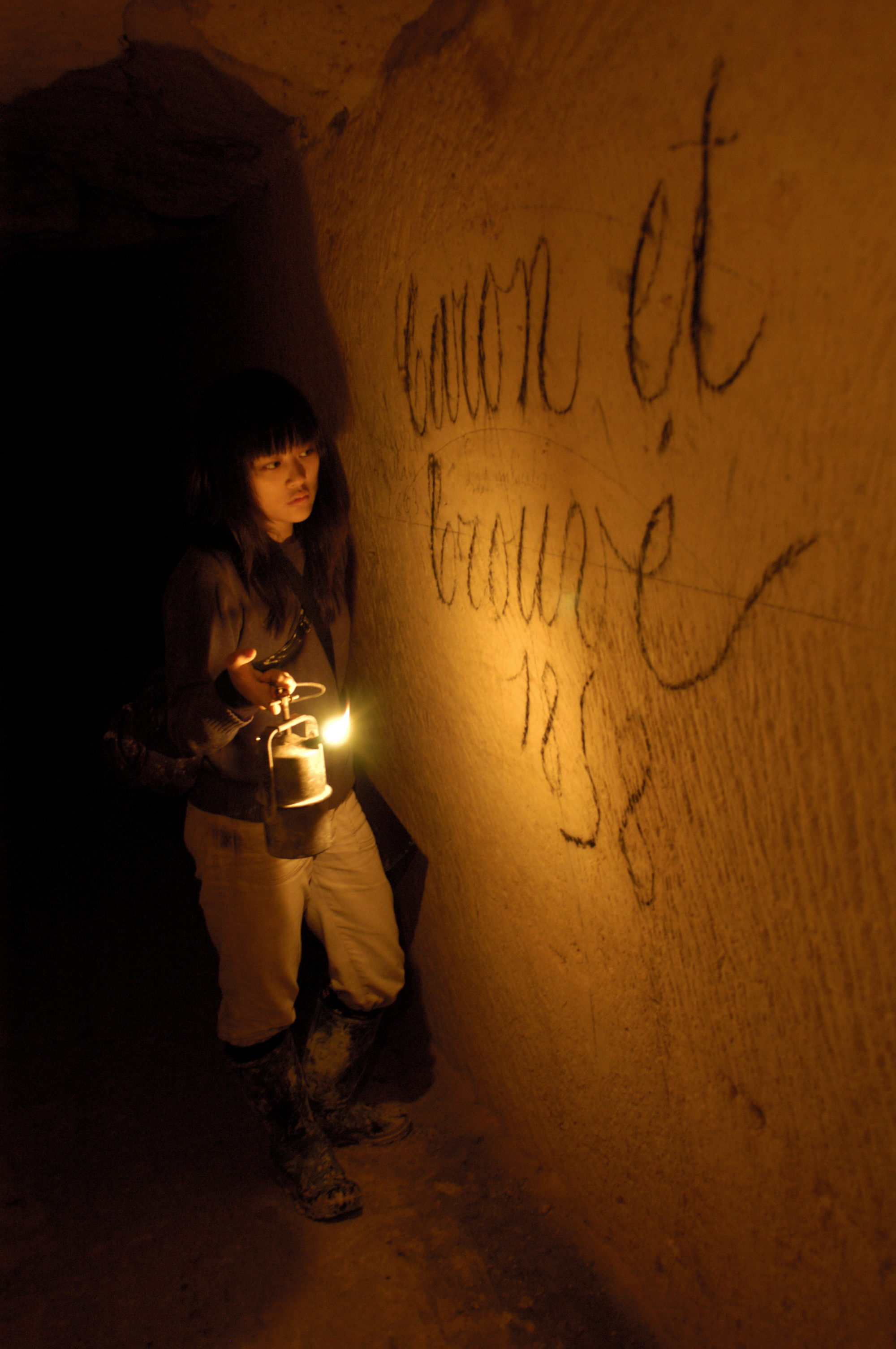 | Description | The artist Miru Kim exploring the Paris Catacombs in 2006, looking at an ancient graffiti from 1858. |