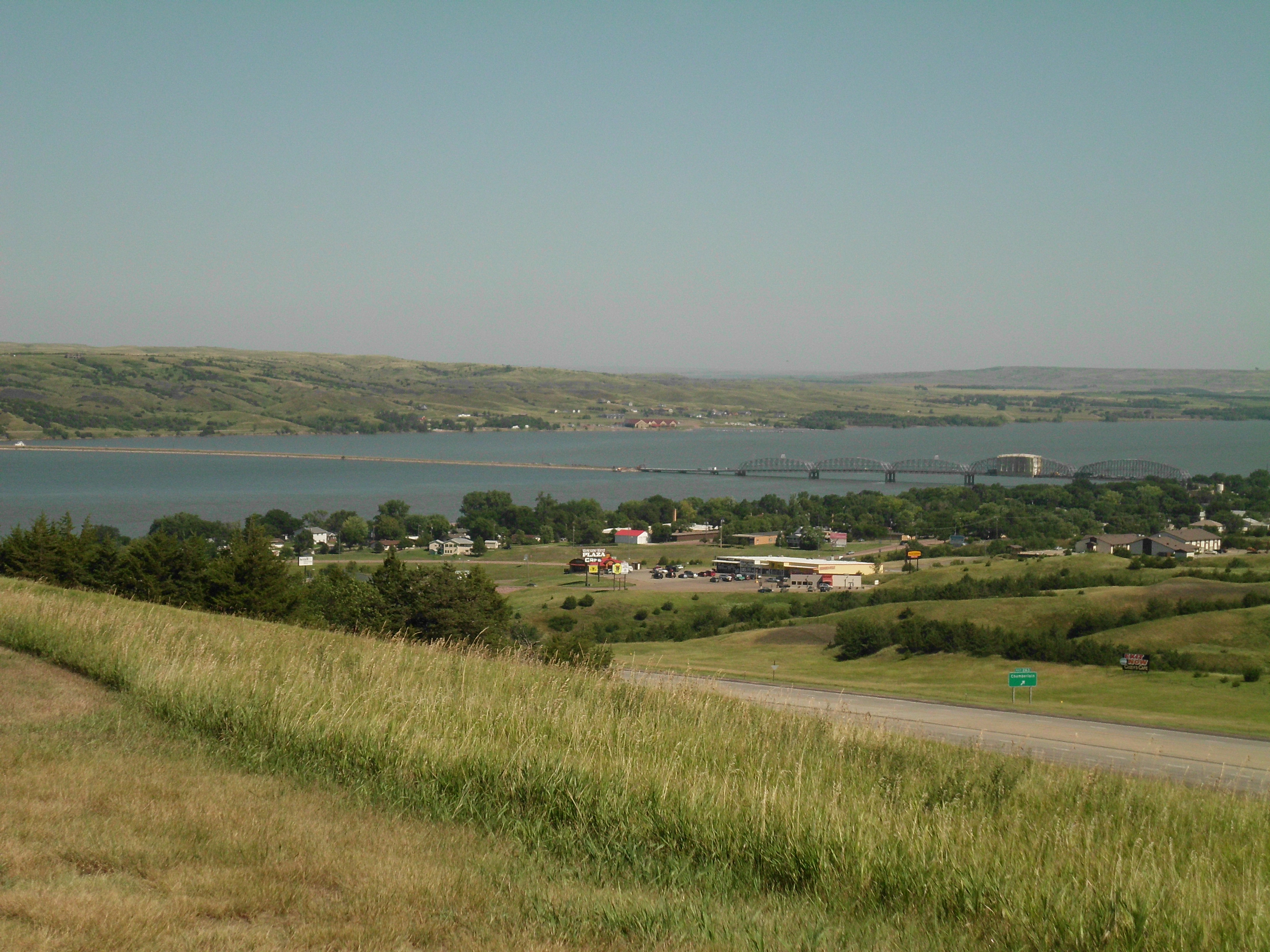 English: The Missouri River as seen from a rest stop on Interstate 90 just south of Chamberlain, South Dakota, and east of the river. |