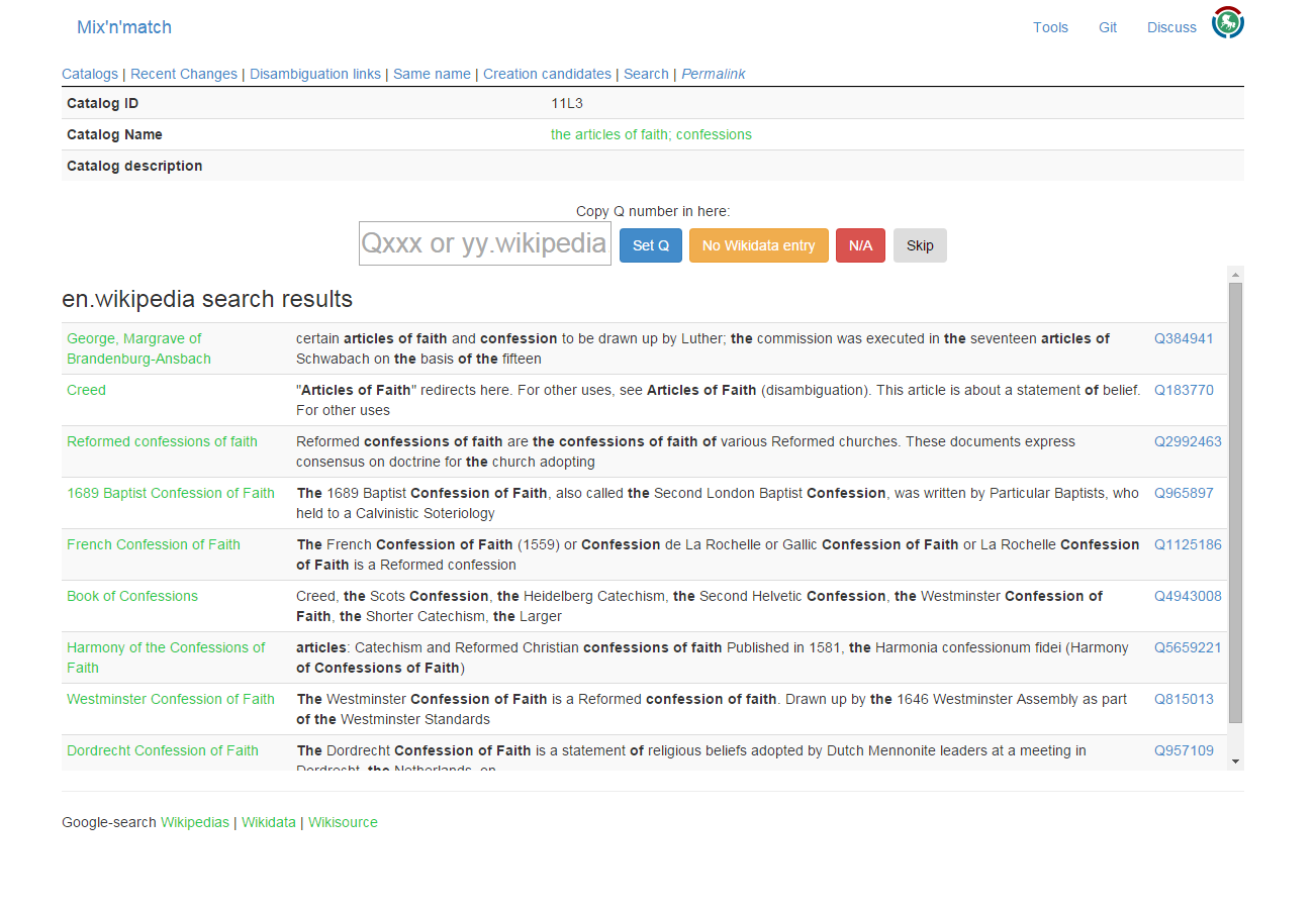 English: A screenshot of Magnus Manske's Mix'n'Match tool. Italiano: Uno screenshot del tool di Magnus Manske Mix'n'Match. |