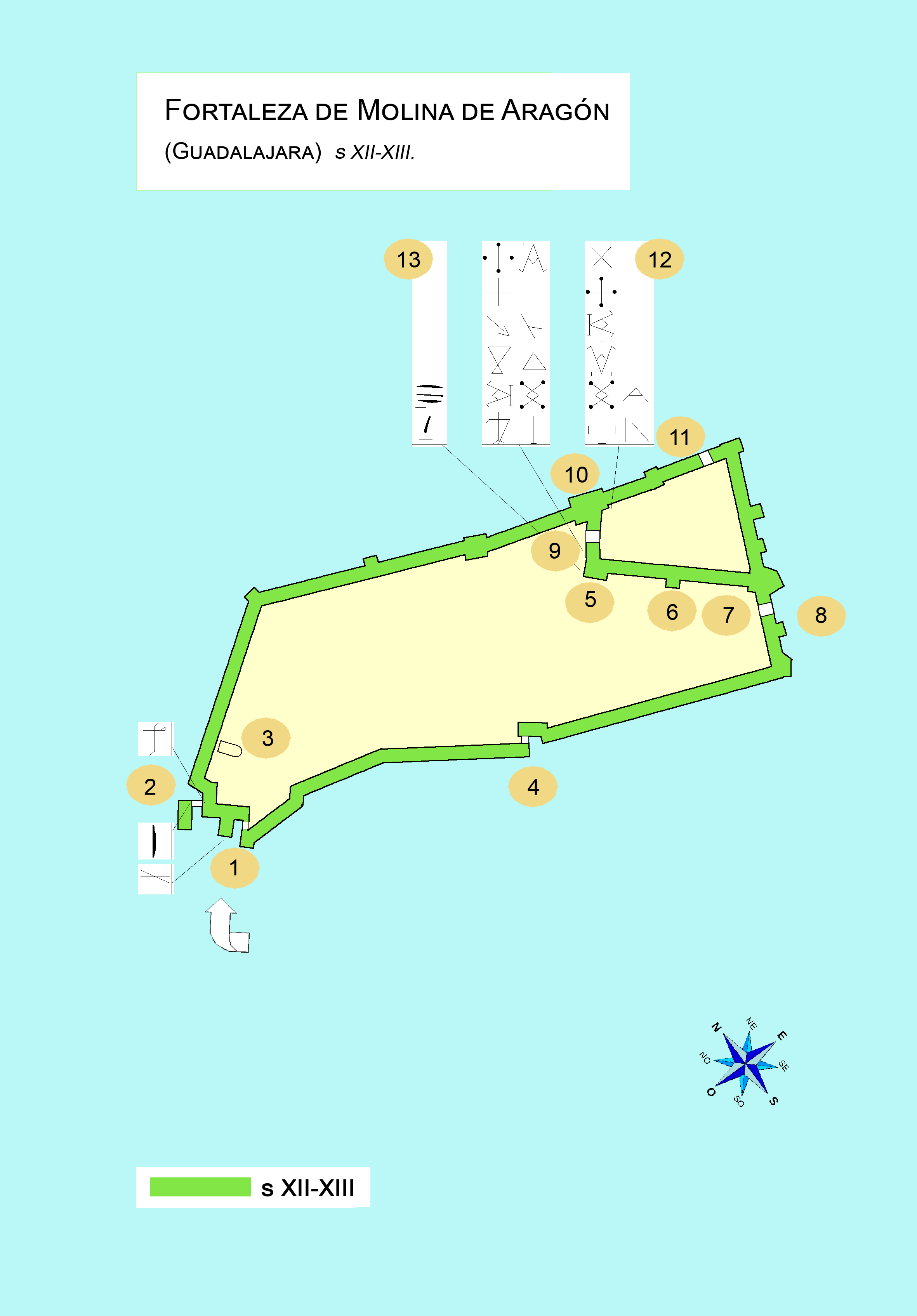 Español: Castillo de Molina de Aragón, (Guadalajara), Castilla-La Mancha, España, s. XII-XIII. Aprox. a la planta y Signos lapidarios. English: Molina de Aragón castle (Guadalajara), Castilla-La Mancha, España, s. XII-XIII. Plan approx. and Stonecutter marks. |