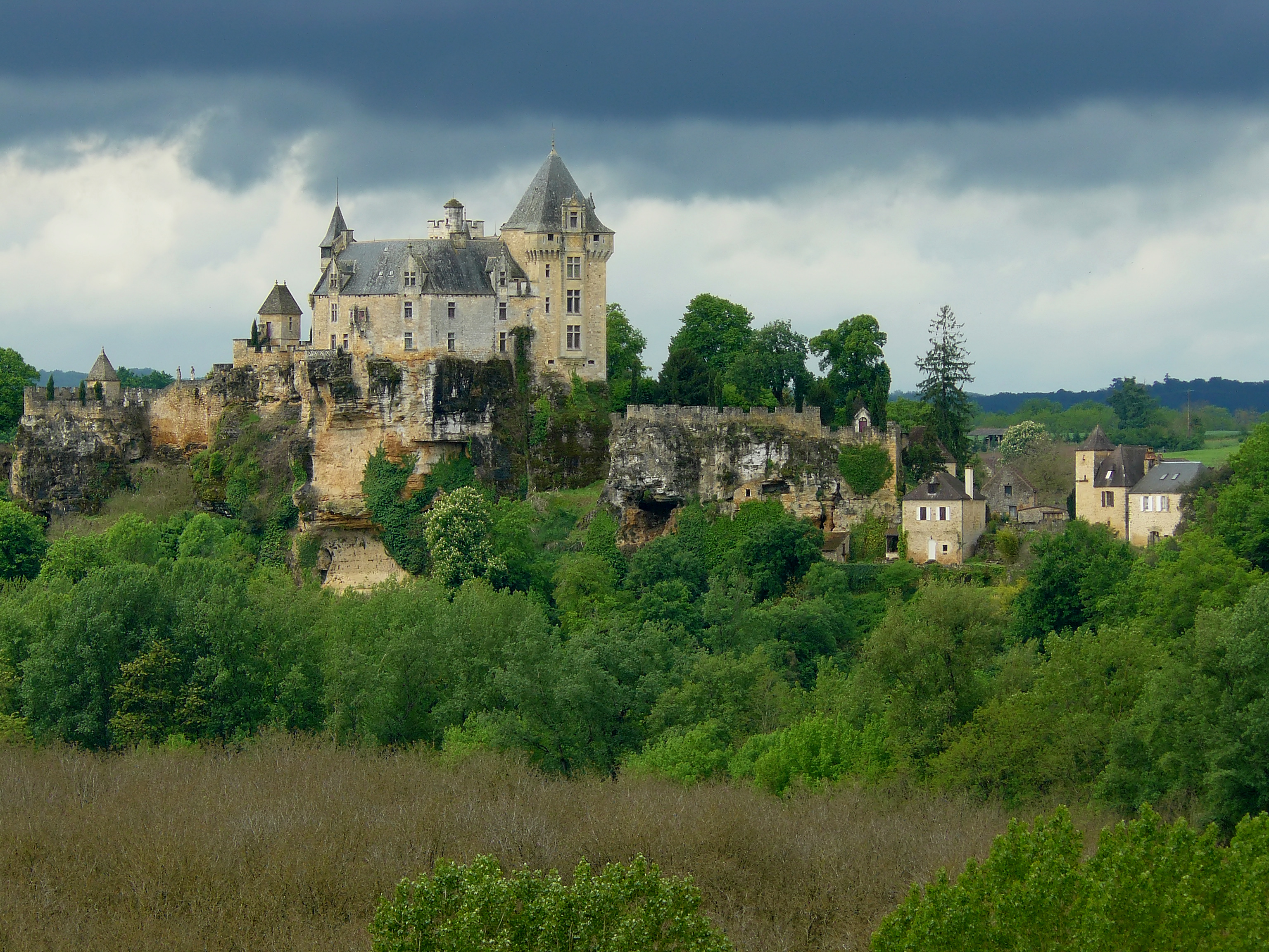 English: Monfort Castle above the Dordogne River from the distance, Département Dordogne/France