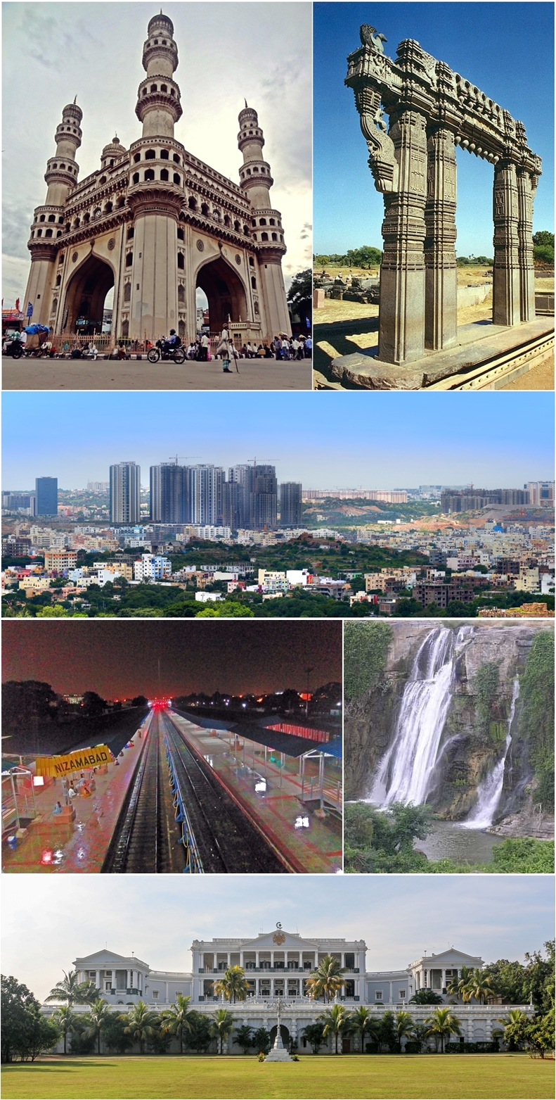 English: Montage of Telangana sidewise from left: Charminar, Warangal Fort, Hyderabad city, Nizamabad Railway Station, Kuntala Waterfalls, Falaknuma Palace |