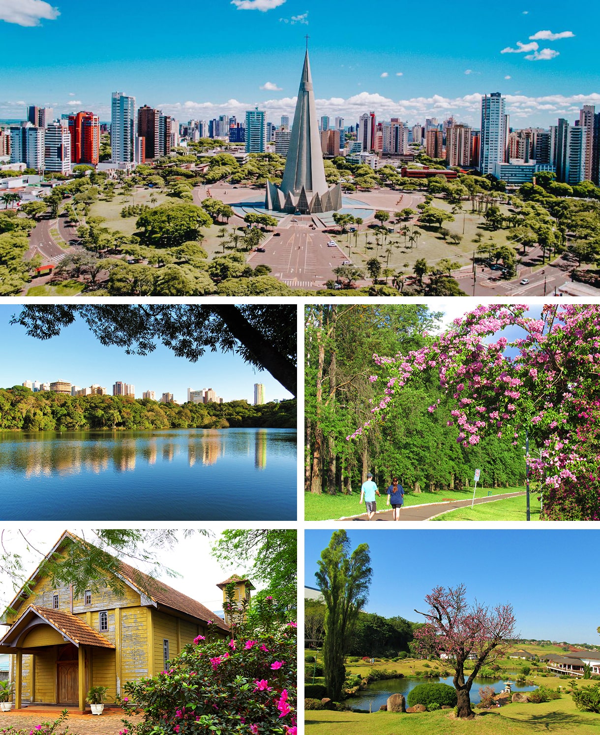 (Portuguese) English: From left to right and top to bottom: skyline of Maringá with the Cathedral of Maringá; the Ingá Park; Grevilea Woods; Chapel of Santa Cruz de Maringá; Park of Japan. |