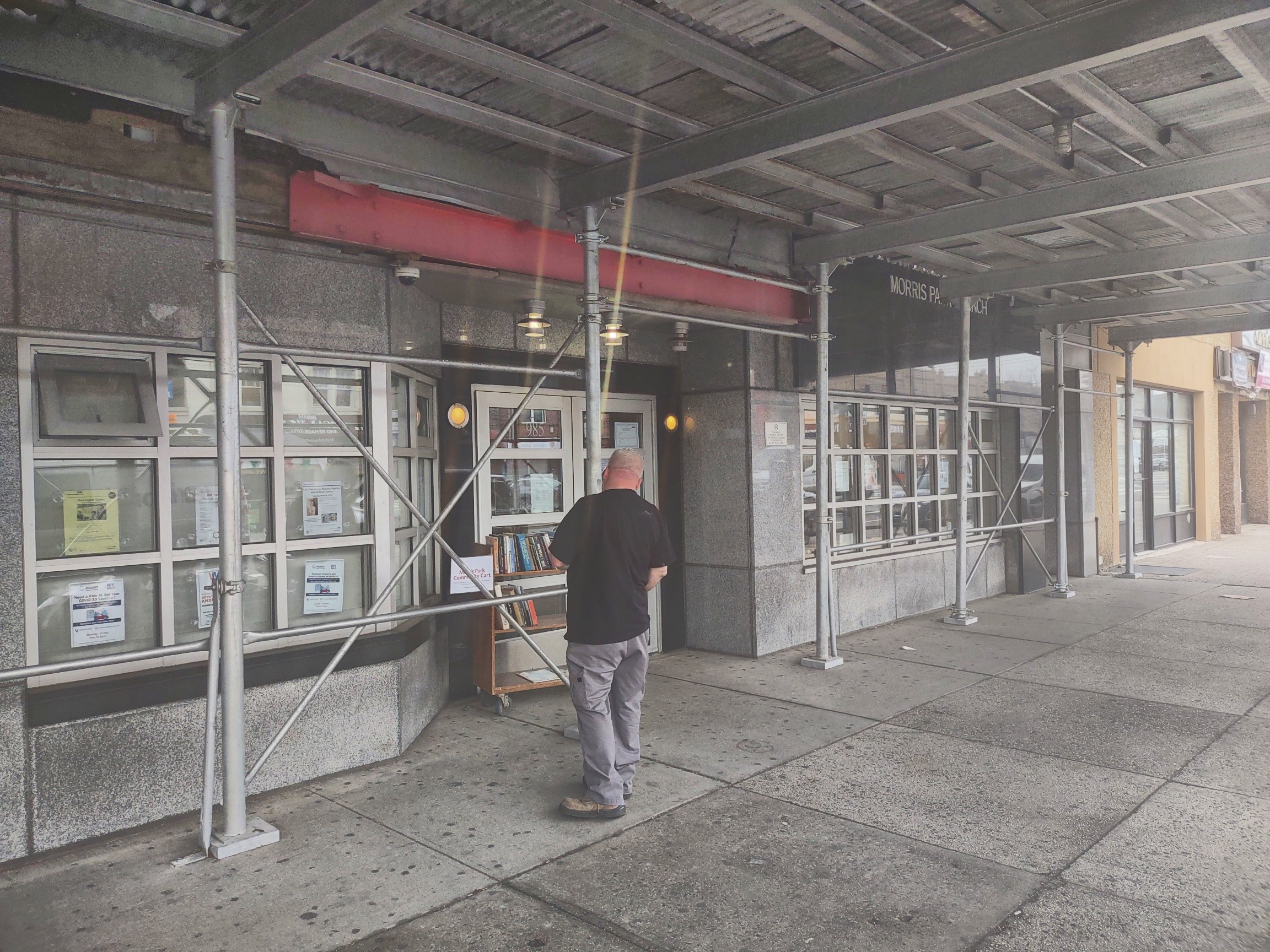 English: Looking north at Morris Park Library (public library in the Bronx, New York, USA)