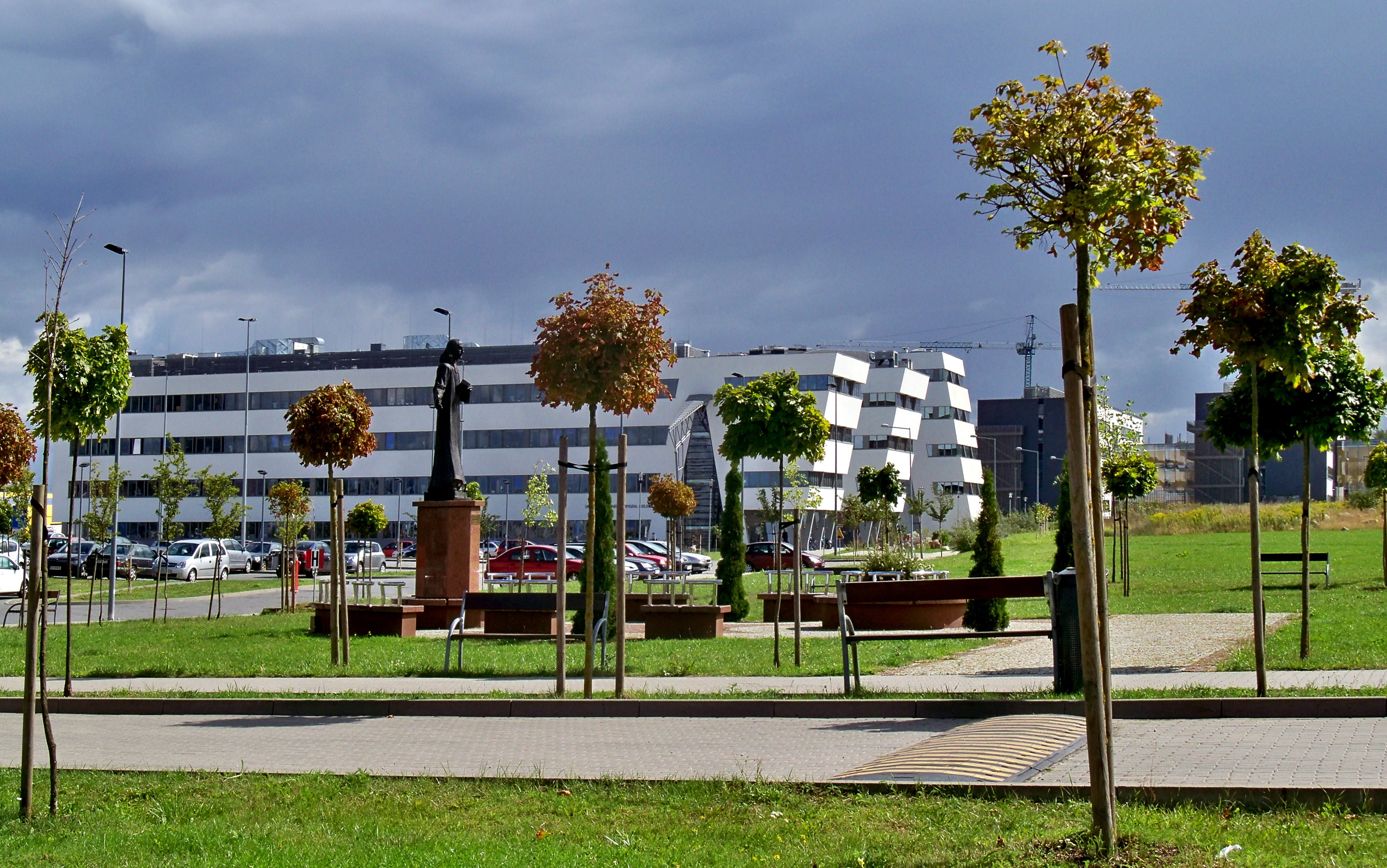 Polski: Bałtycki Kampus Oliwa w Gdańsku między ulicami Wita Stwosza a Grunwaldzką. Na pierwszym planie pomnik Mrongowiusza, w tle gmach Wydziału Biologii |