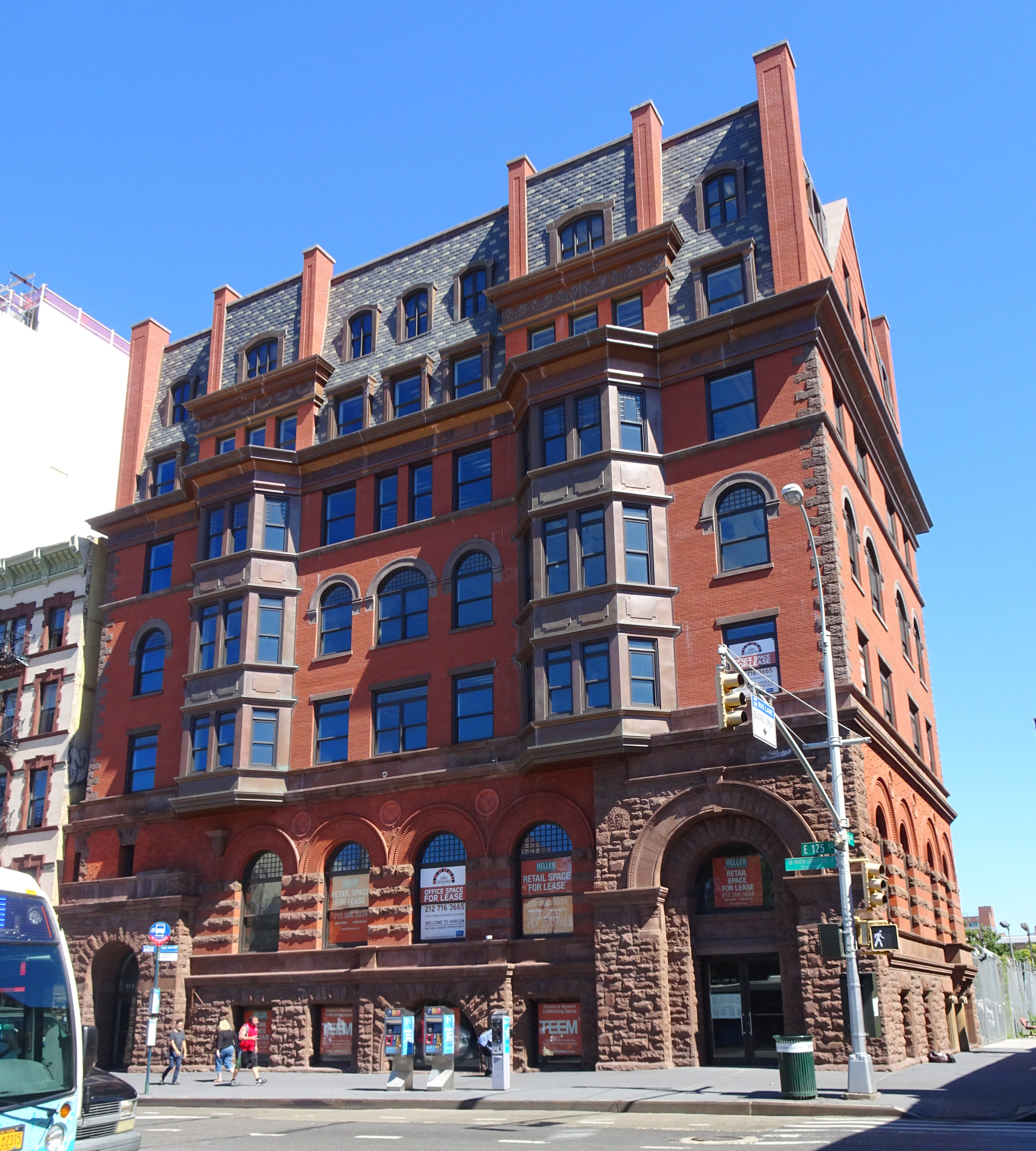 English: Looking north at rebuilt Mount Morris Bank on a sunny late morning |