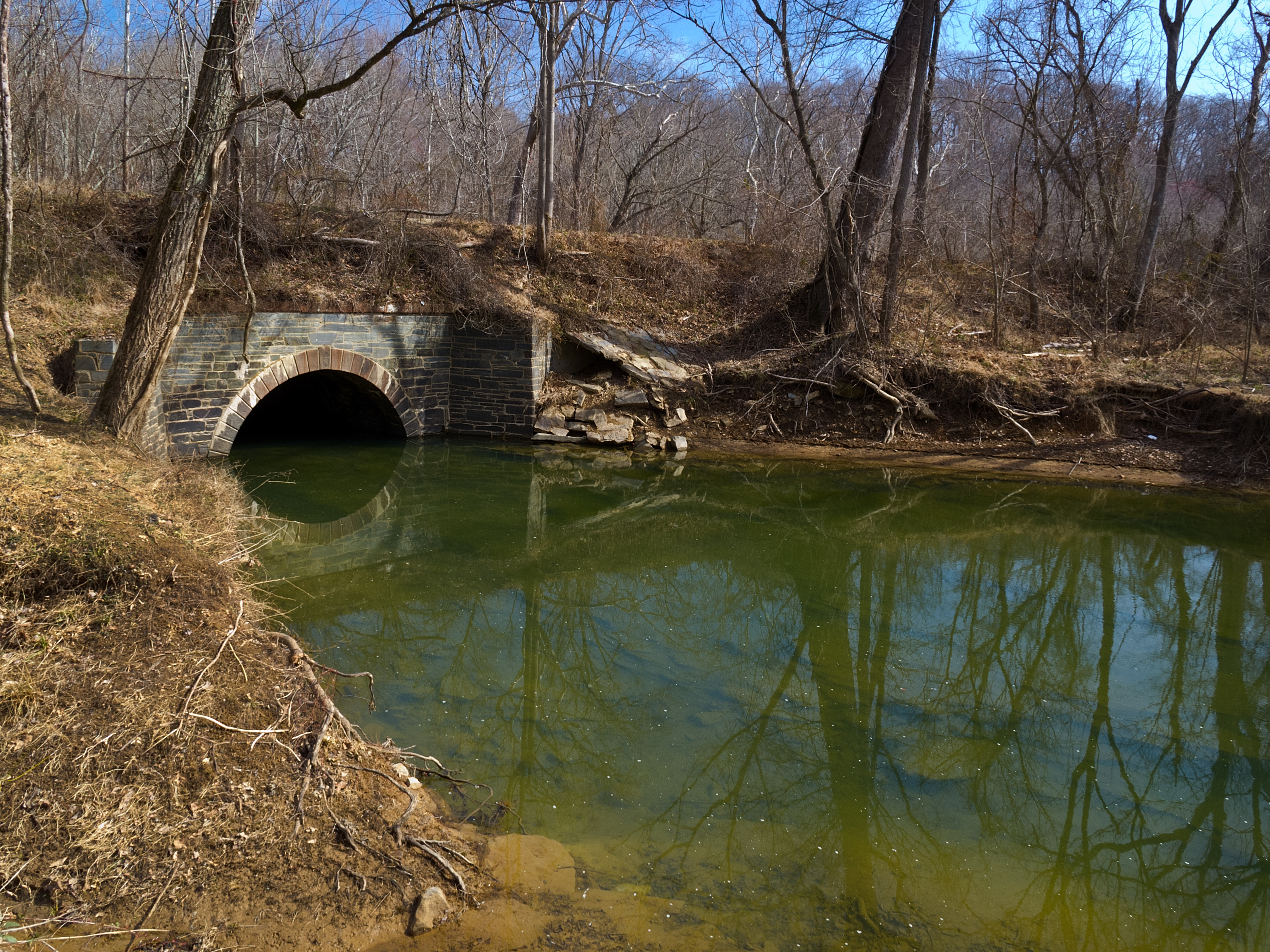 English: Muddy Branch, and the culvert it uses to go under the Chesapeake and Ohio Canal |