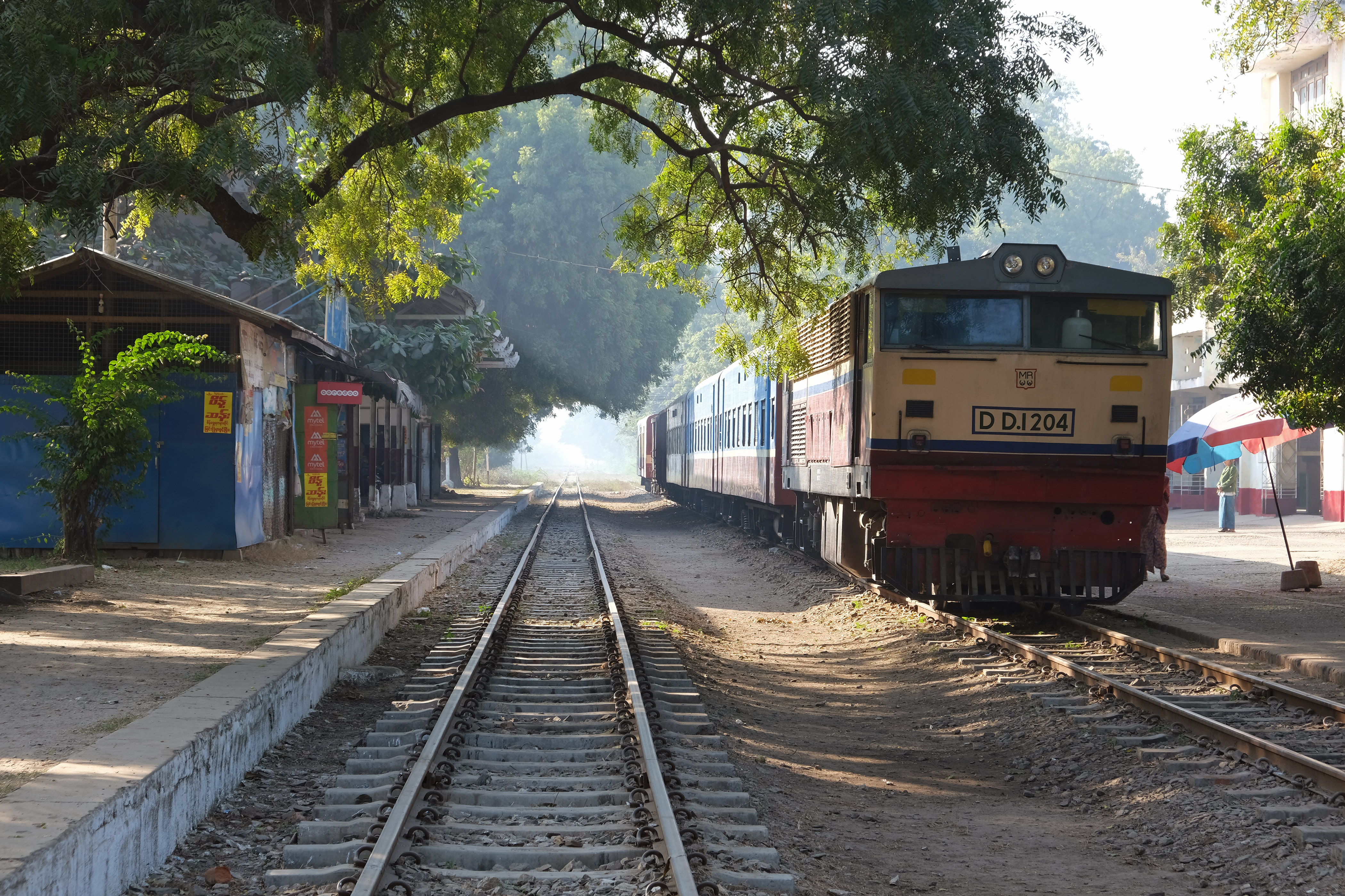 English: Train from Bagan to Mandalay stopping at Myingyan Railway Station. |