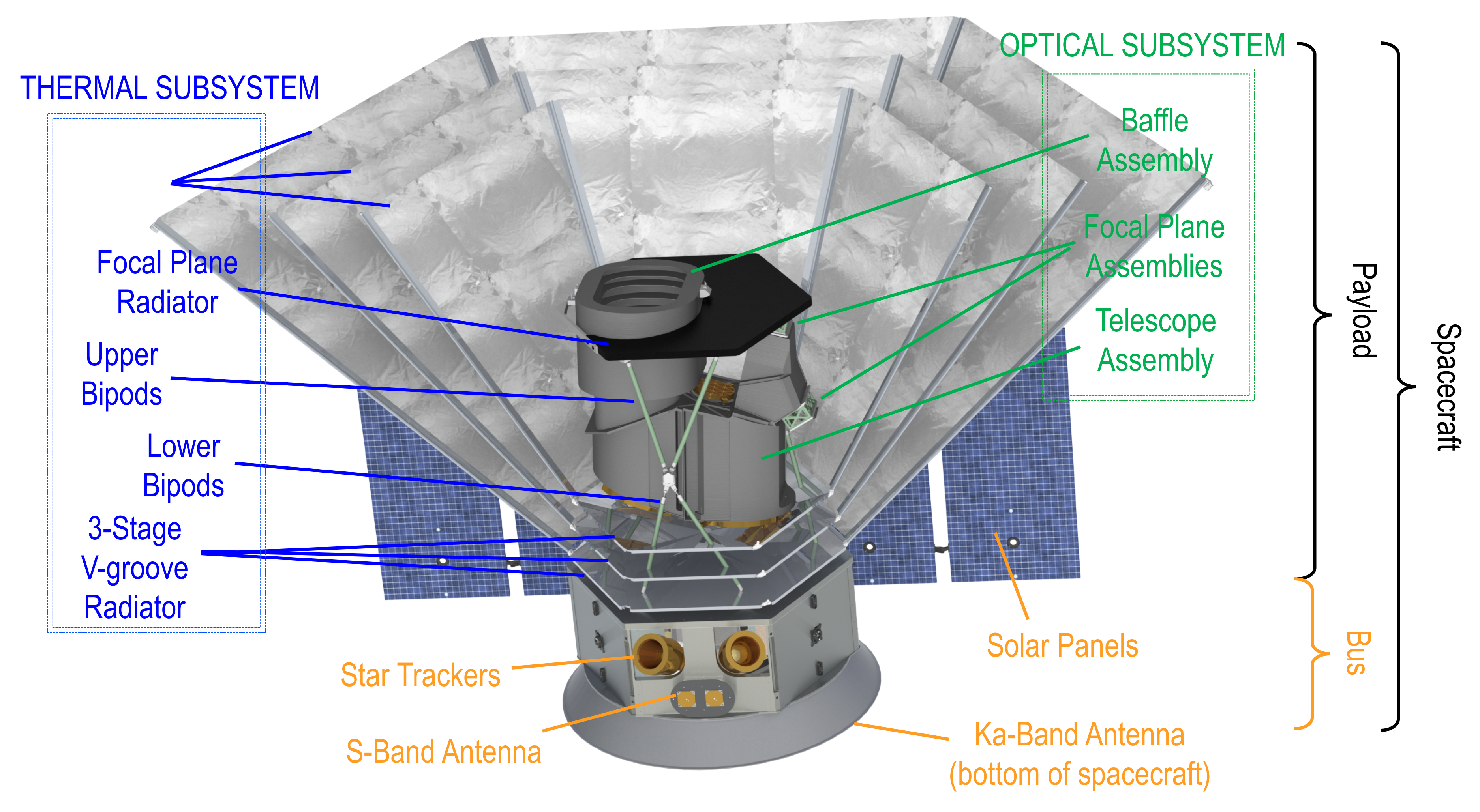 SPHEREx spacecraft (photon shields cut away) showing the bus with the payload optical and thermal subsystems. The optics and detector cool passively by radiating heat to space with a 3-stage V-groove passive cooler. Lightweight deployed photon shields protect the cooler and optics from radiation from the Sun and Earth. |