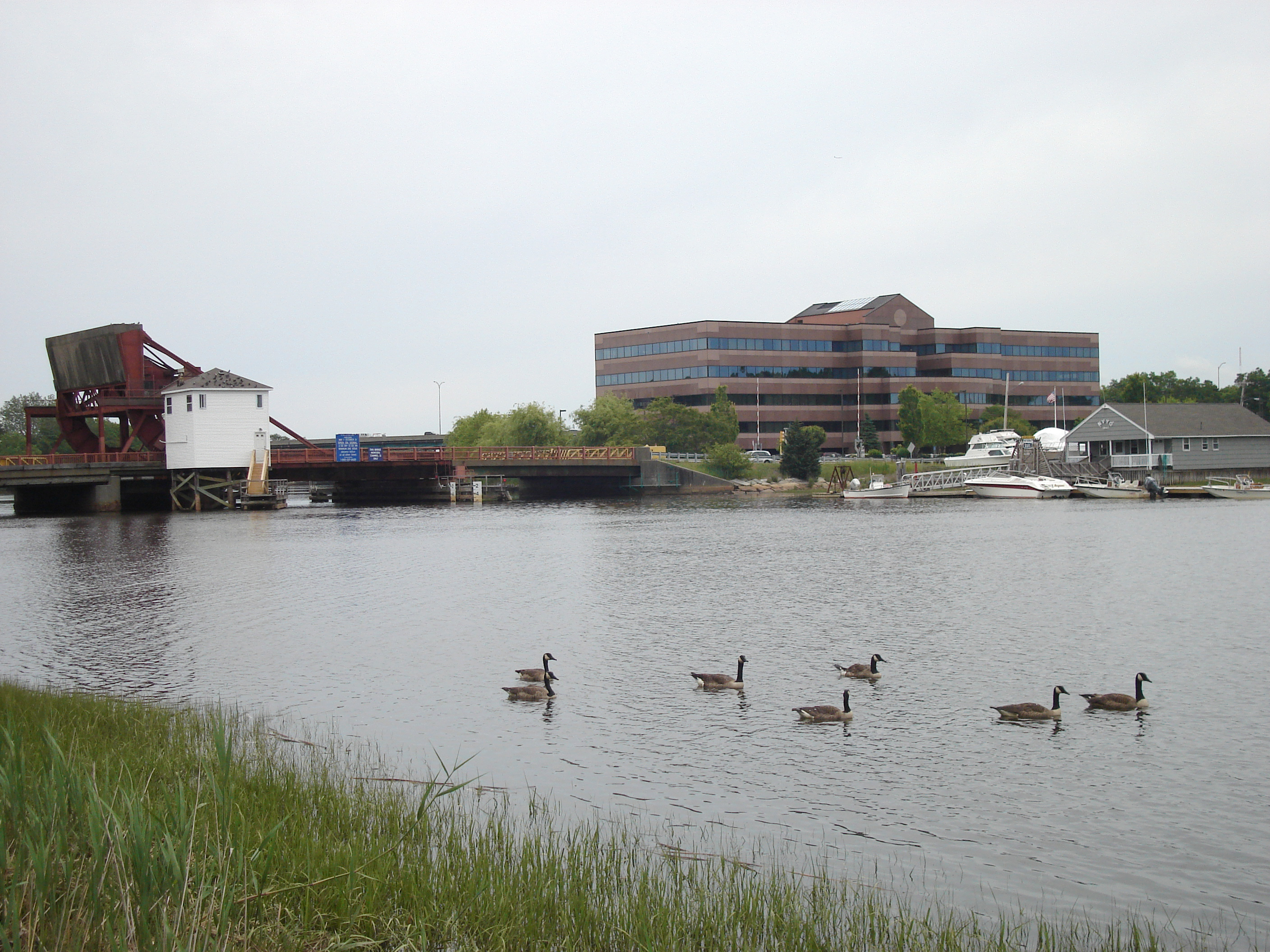 English: Looking east toward the Granite Avenue Bridge from the Dorchester, Massachusetts shore of the Neponset River. The Neponset Valley Yacht Club marina and a State Street Corporation-leased office building are visible on the Milton side of the river. |
