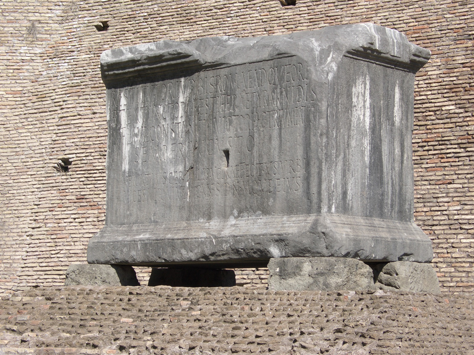 Restitutori urbis Romae adque orb[is] / et extinctori pestiferae tyrannidis / d(omino) n(ostro) Fl(avio) Iul(io) Constantio victori ac triumfatori / semper Augusto / Neratius Cerealis v(ir) c(larissimus) praefectus urbi / vice sacra(rum) iudicans d(evotus) n(umini) m(aiestati)que eius