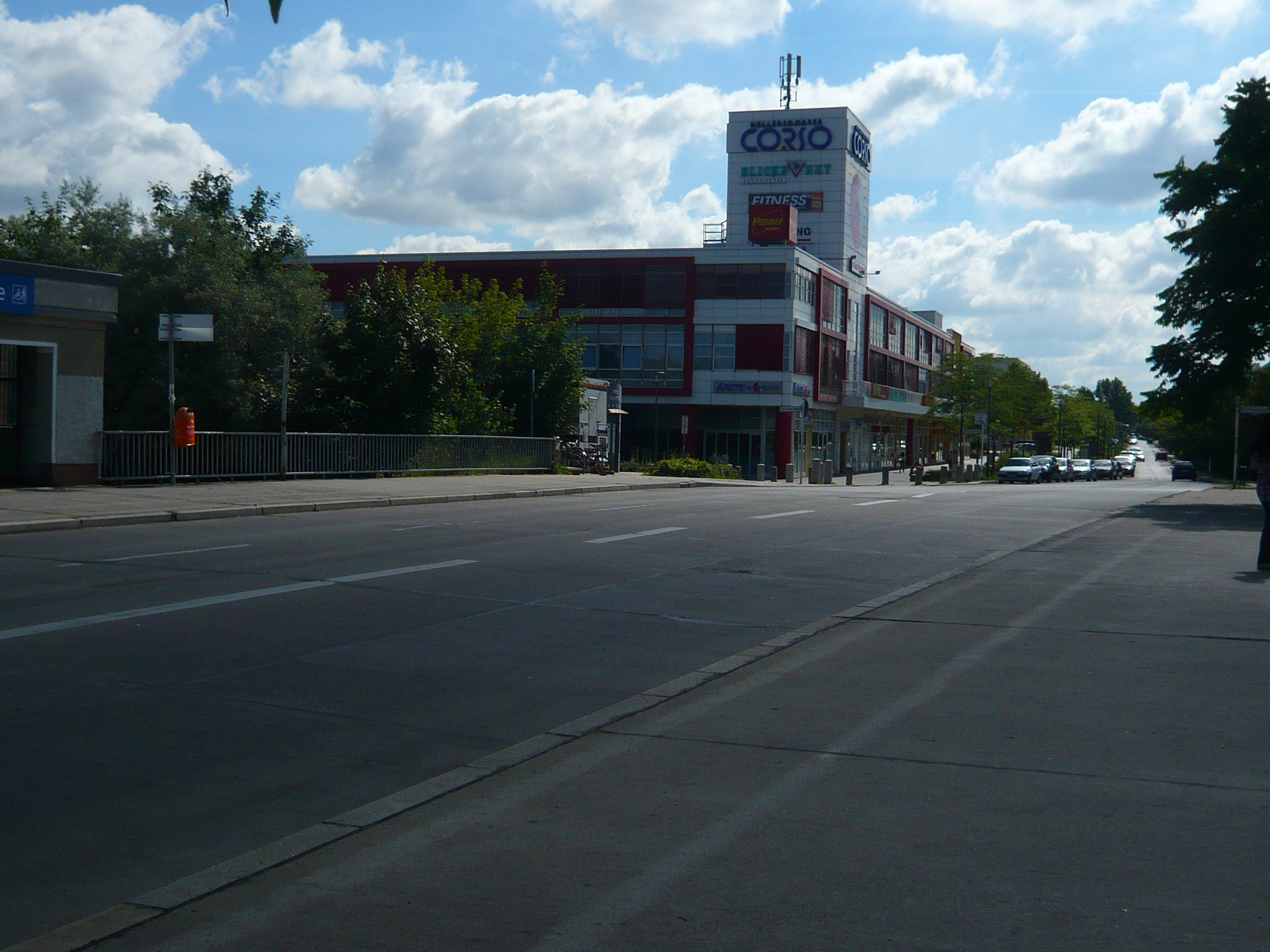Deutsch: Berlin-Hellersdorf, Blick in die Neue Grottkauer Straße. Links das Einkaufszentrum 'Hellersdorfer CORSO' (nun nach Besitzerwechsel seit ca. 2020 das 'FORUM KIENBERG', mit geänderter farblicher Außengestaltung). Fotostandpunkt ist die Brücke über die U-Bahngleise am U-Bahnhof 'Neue Grottkauer Straße' (nun, vermutlich seit der IGA 2017 U-Bahnhof 'Kienberg Gärten der Welt'), fast an der Kreuzung zur Hellersdorfer Straße.