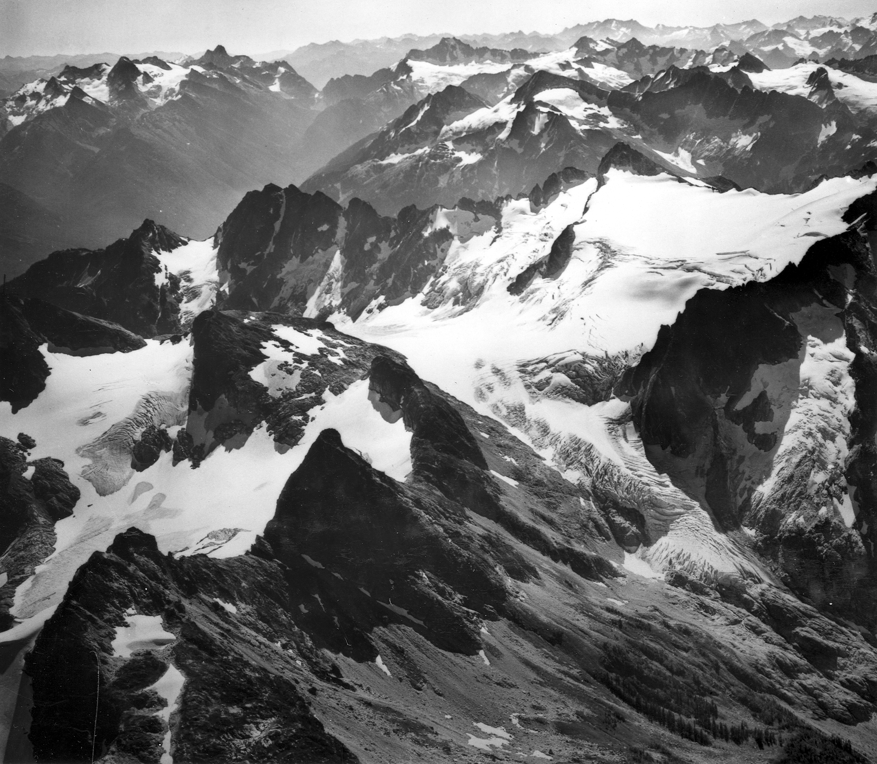 Ladder Creek and Neve Glaciers, Snowfield Peak, in North Cascades National Park. This scene displays the rugged nature of the North Cascades where glacierized peaks rise abruptly from heavily timbered valleys that are less than 1,000 m above sea level. The Cascade divide is crossed by trail at Park Creek Pass (altitude 1,845 m) top left; Goode Mountain (altitude 2,800 m) is to the left, and Buckner Mountain (altitude 2,780 m) with Boston Glacier (7 square km in area) is to the right of the pass. Timberline is at about 1,860 m. Skagit and Whatcom Counties, Washington. ca. 1966. (Aerial view) Published as figure 4 in U. S. Geological Survey. Professional paper 715-A. 1971. Pinnacle Peak (bottom left) and Paul Bunyans Stump (bottom left center) with Colonial Glacier behind and left; Snowfield Peak (upper right center middle distance) with Neve Glacier descending past the center to the left and Ladder Creek Glacier descending from the center toward the lower right. View direction: 150° Image file: http://libraryphoto.cr.usgs.gov/htmllib/btch453/btch453j/btch453z/mmf00003.jpg |