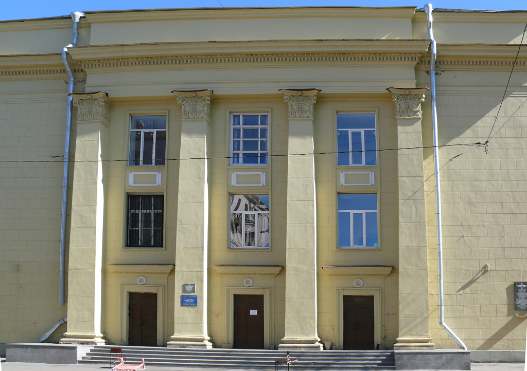 English: Main entrance (West façade) of the Institute of Peoples of the North, former School 52 in St. Petersburg (Prospect Stachek 30)