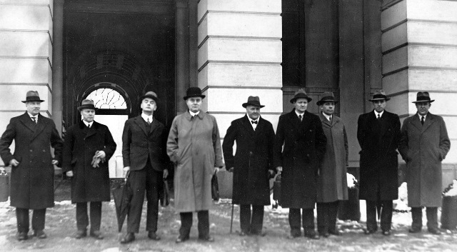 style="background: #ffdddd" class="table-no" | Johan Nygaardsvolds regjering. Fra venstre: Finansminister Adolf Indrebø, forsvarsminister Fredrik Monsen, utenriksminister Halvdan Koht, statsminister Johan Nygaardsvold, landbruksminister Hans Ystgaard, handelsminister Alfred Madsen, sosialminister Kornelius Bergsvik, undervisningsminister Nils Hjelmtveit og justisminister Trygve Lie English: Cabinet Nygaardsvold. From left: Minister of Finance Adolf Indrebø, Minister of Defence Fredrik Monsen, Minister of Foreign Affairs Halvdan Koht, Prime Minister Johan Nygaardsvold, Minister of Agriculture Hans Ystgaard, Minister of Trade Alfred Madsen, Minister of Social Affairs Kornelius Bergsvik, Minister of Education Nils Hjelmtveit and Minister of Justice Trygve Lie |