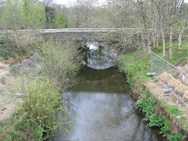 English: Old bridge at Two Bridges. A view looking southeast towards the old bridge near the Two Bridges parking area off the A30 dual carriageway. The temporary fences either side of the River Inny enclose the site of the construction of abutments for a new footbridge. |