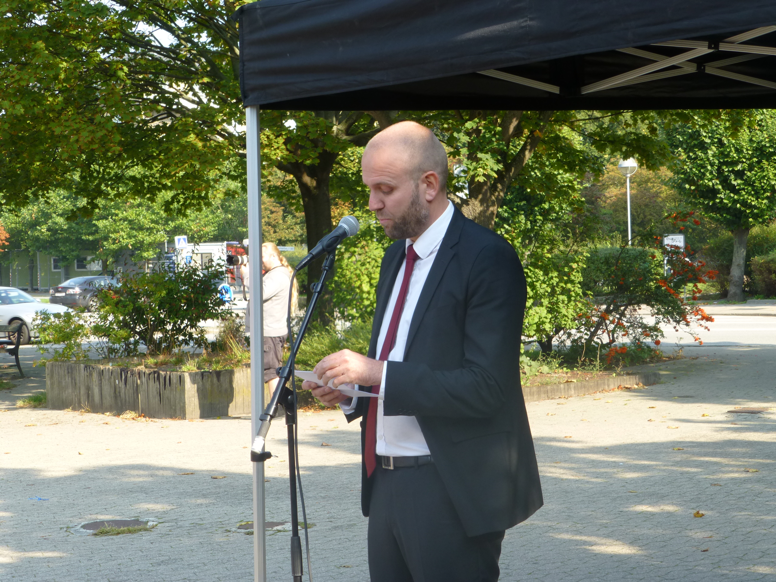 English: Opening of the bus rapid transit (also called Plusway) Den kvikke vej at Hans Knudsens Plads in Østerbro in Copenhagen. Chairman of Movia and mayor of Herlev Thomas Gyldal Petersen speaking. |