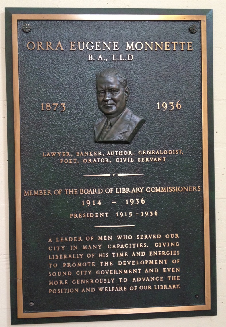 English: Replacement plaque, dedicated to Orra E. Monnette, President of the Los Angeles Public Library system from 1915-1936. The plaque is on display in the Los Angeles Central Library rotunda and replaces an earlier bronze bust of Monnette lost in the Central Library fire. |