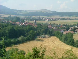Deutsch: Meimbressen, Ortsansicht von Norden nach Süden, in der Mitte des Ortes die Kirche, dahinter der Ort Ehrsten, im Hintergrund der Dörnberg. |