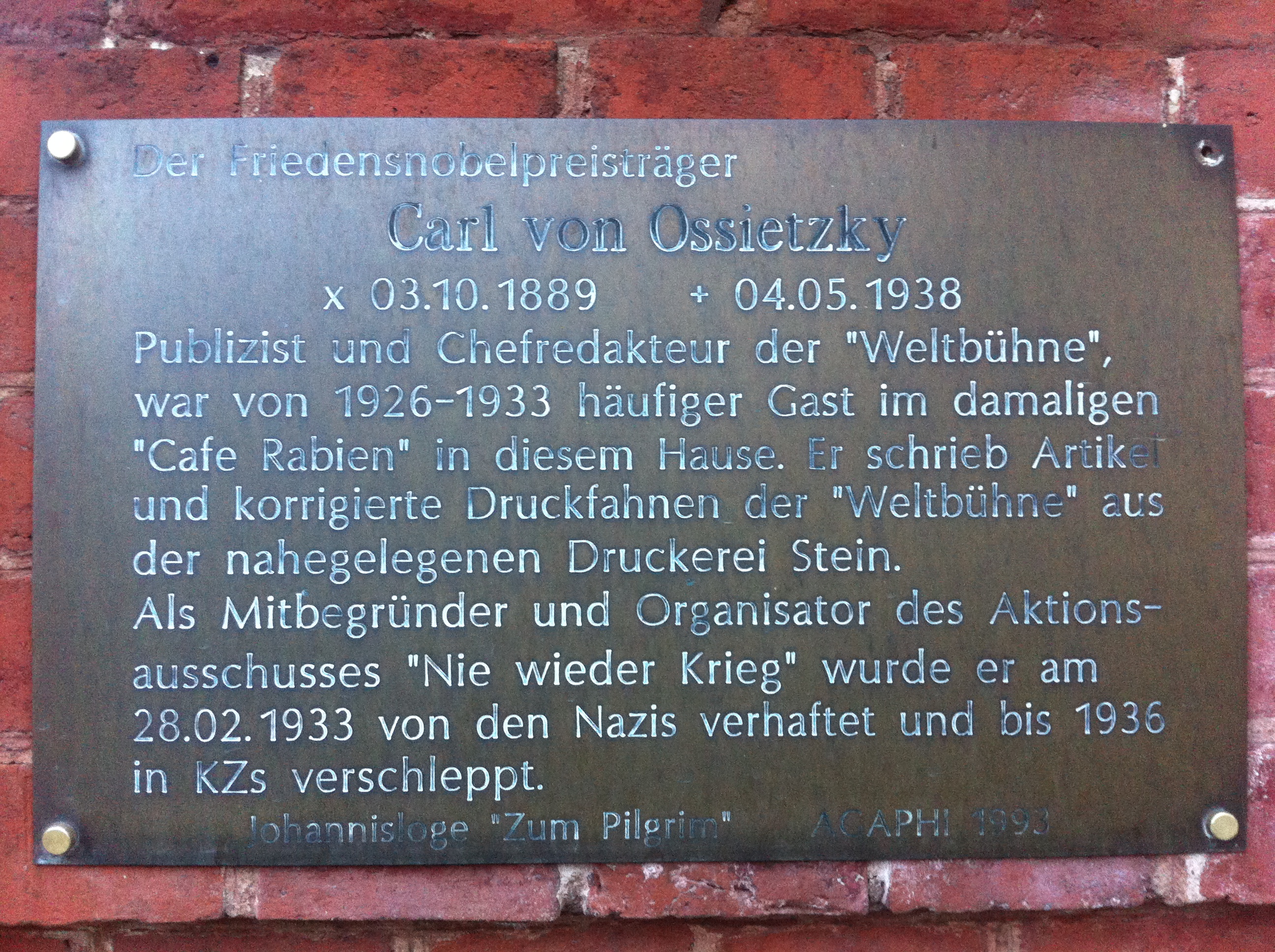 - 2015-01-12 17:07:08 Hans1919 (2531698 Bytes) {{Information |Beschreibung = Gedenktafel Ossietzkys am Café Heider |Quelle = selbst fotografiert |Urheber = ~~~ |Datum = 12.01.2015 |Genehmigung = |Andere Versionen = |Anmerkungen = }}