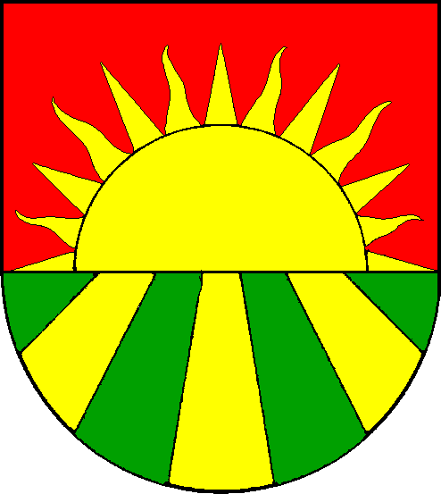 Deutsch: Wappen der Gemeinde Ostenfeld (Rendsburg) im Kreis Rendsburg-Eckernförde, Schleswig-Holstein. Blasonierung: Geteilt. Oben in Rot eine oberhalbe, strahlende goldene Sonne an der Teilungslinie, unten von Grün und Gold sechsmal gestürzt-fächerförmig gespalten. |